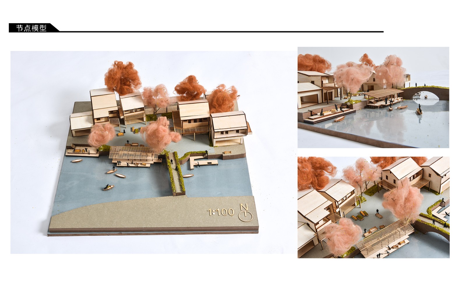 在節(jié)點設(shè)計上,我們選取了兩個公共廣場。第一個水街市集是超市貨物的補給中心,也是超市人流量最大的廣場,在這里我們設(shè)計了碼頭,來自其他村落的人可以選擇乘船來販賣他們的種植成果,顧客可以在岸邊采購,一些顧客可以乘船采購。另一個節(jié)點是場地原有的內(nèi)街空間,加入了格柵和平臺,用這些設(shè)計界定空間,村民可以在這個空間展示教授一些食物制作技藝。游客可以在這里進行休息,與村民互動交流。