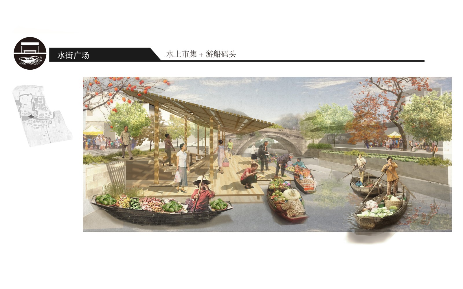▲ 水街廣場的效果圖,激發(fā)江南水鄉(xiāng)村落活力,水上活動是重點,設(shè)計的水邊平臺兼具水上集市和游船碼頭兩功能。