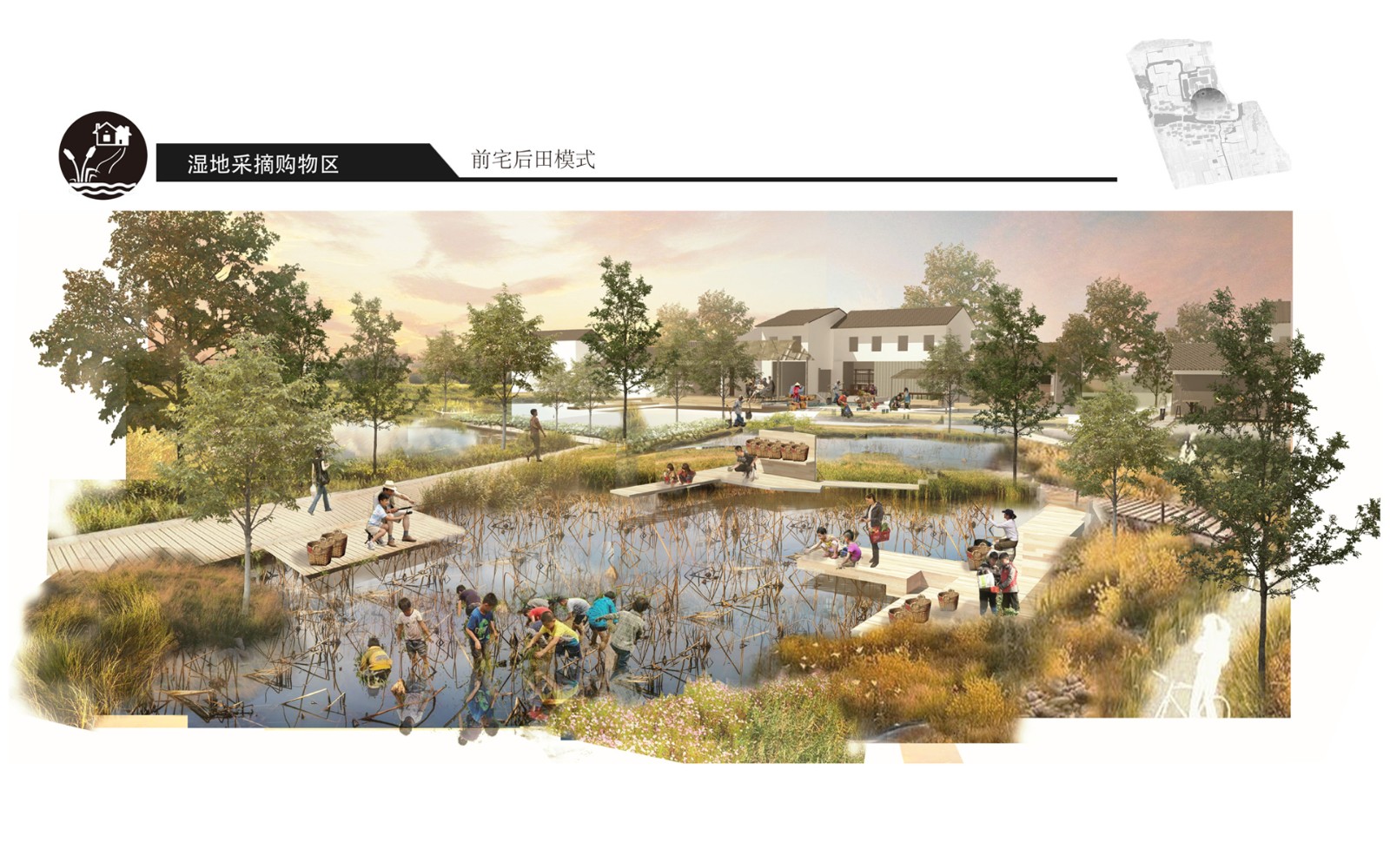 ▲ 濕地采摘購物區(qū)的效果圖,保留原場地前宅后田的結(jié)構(gòu)和桑基魚塘的種植傳統(tǒng),同時結(jié)合超市購物體驗。