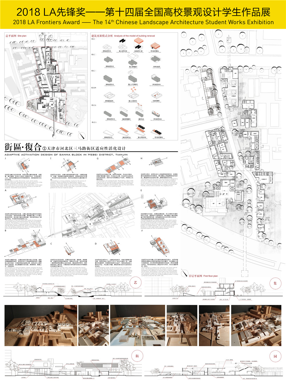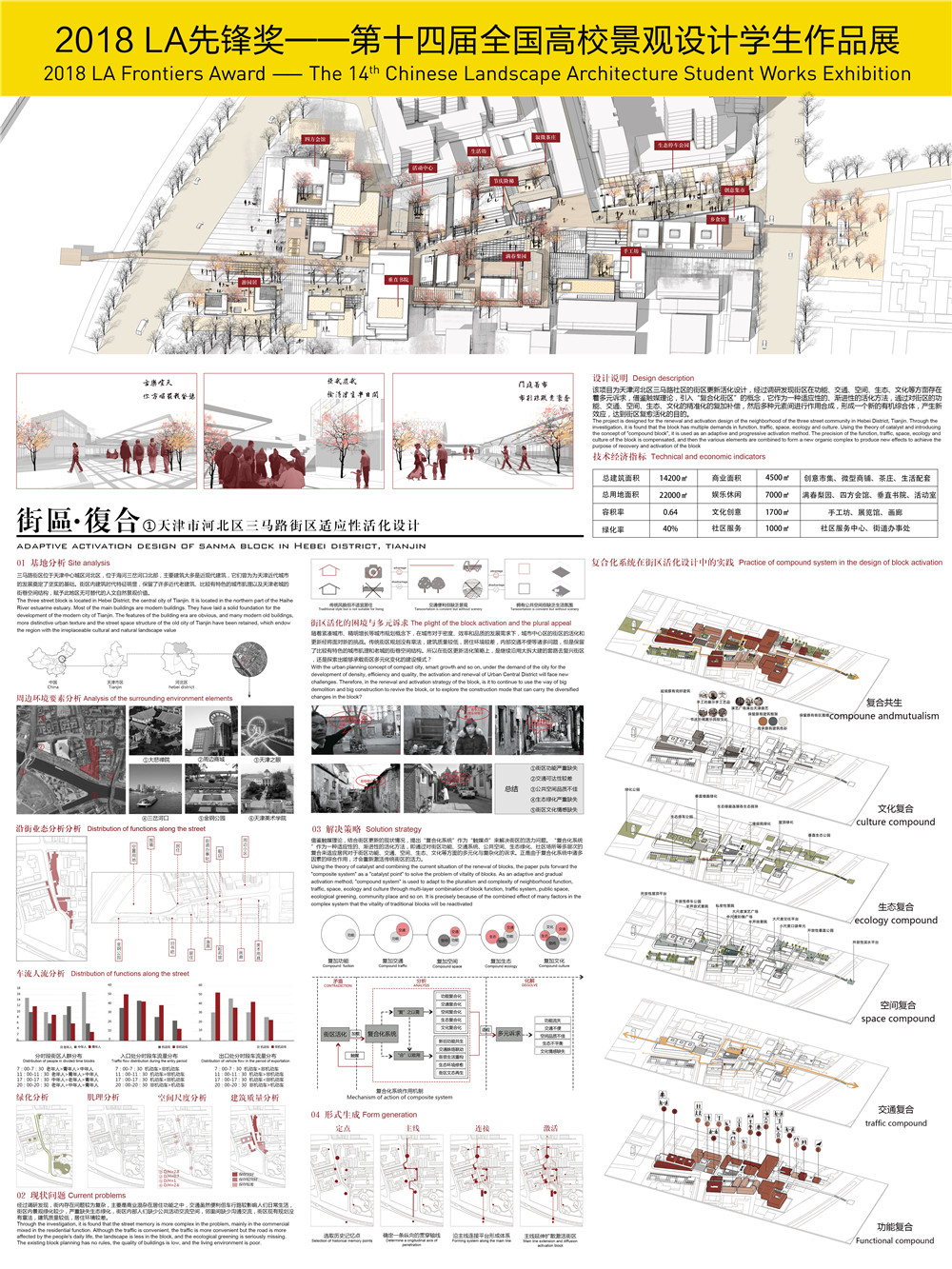 項目介紹:結(jié)合街區(qū)更新的現(xiàn)狀情況,借鑒觸媒理論,提出“復(fù)合化系統(tǒng)”作為“觸媒點”來解決街區(qū)的活力問題。設(shè)計上主張街區(qū)作為一個有機(jī)生長、新陳代謝的生命體,“復(fù)合化系統(tǒng)”作為一種適應(yīng)性的、漸進(jìn)性的活化方法,即通過對街區(qū)功能、交通系統(tǒng)、公共空間、生態(tài)綠化、社區(qū)場所等多層次的復(fù)合來適應(yīng)居民對于街區(qū)功能、交通、空間、生態(tài)、文化等方面的多元化與復(fù)雜化的訴求。正是由于復(fù)合化系統(tǒng)中諸多因素的綜合作用,才會激活傳統(tǒng)街區(qū)的活力,實現(xiàn)街區(qū)的活化再生是構(gòu)建復(fù)合化系統(tǒng)的最終目標(biāo)。
