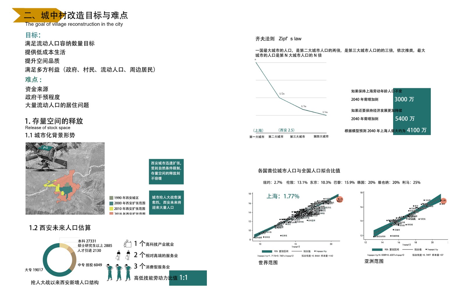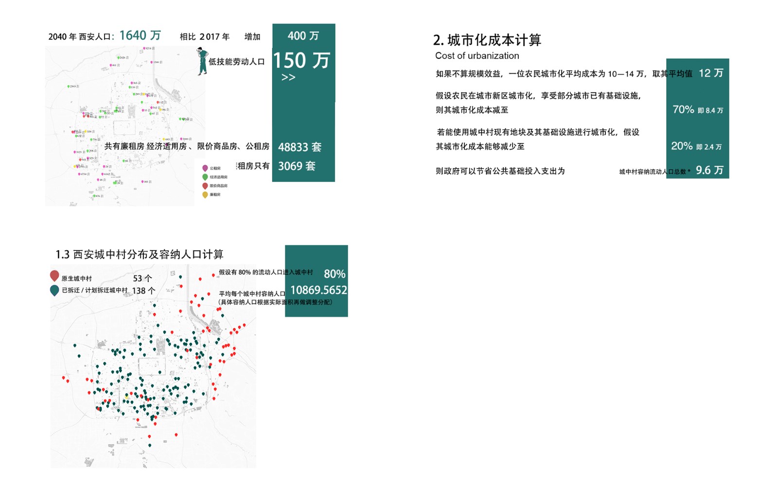 在甘家寨調(diào)研時被城中村的活力所驚嘆,甘家寨并非傳統(tǒng)意義上的城中村,其是在2010年時被拆遷安置至此,但是在這樣的兵營式社區(qū)中,村民與外來租客依然巧妙的利用空間賦予了甘家寨數(shù)不盡的活力,而這種活力對村民、對租客乃至周邊居民都提供了巨大的利益。由此,我們不禁設(shè)想如果城市中現(xiàn)有的城中村每一個都能夠得以保留,那么其為城市提供的長遠利益將是巨大的,因此,此次設(shè)計我們不僅僅將目光局限于場地,而是放大到了整個西安城市,希望通過準(zhǔn)確的計算,與切實可行的導(dǎo)則編制,為保留城中村提供一份切實可行的依據(jù)。