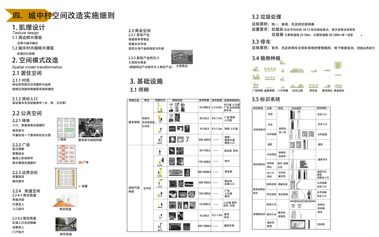▲城中村空間改造實施細則(肌理設(shè)計、空間模式改造、基礎(chǔ)設(shè)施)