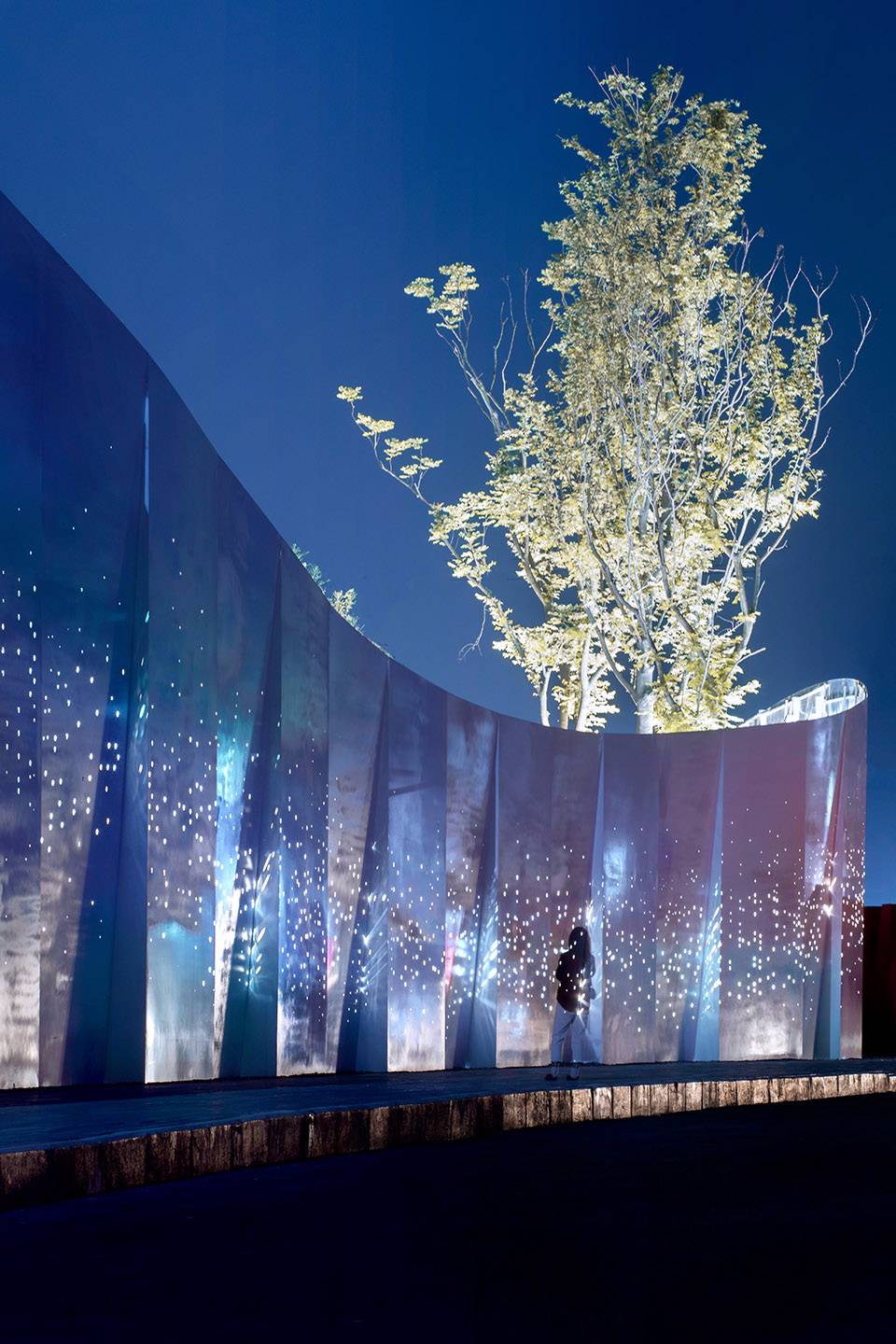 星空幕布入口處形成時(shí)空隧道,猶如宇宙黑洞。末端處高光亮點(diǎn)出口,霧氣彌漫,竹林若隱若現(xiàn),繁星閃爍,鳴叫聲由遠(yuǎn)及近,貌似森林狂想曲,充滿神秘感。黑色鏡面鋼和燈光相互交映,恍如穿越時(shí)空。時(shí)空的那頭,等待著你的解讀。