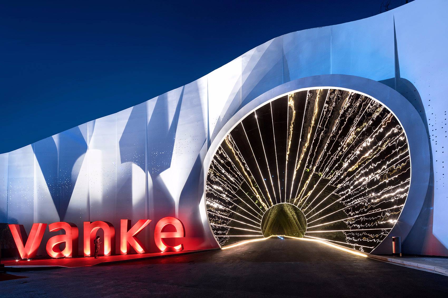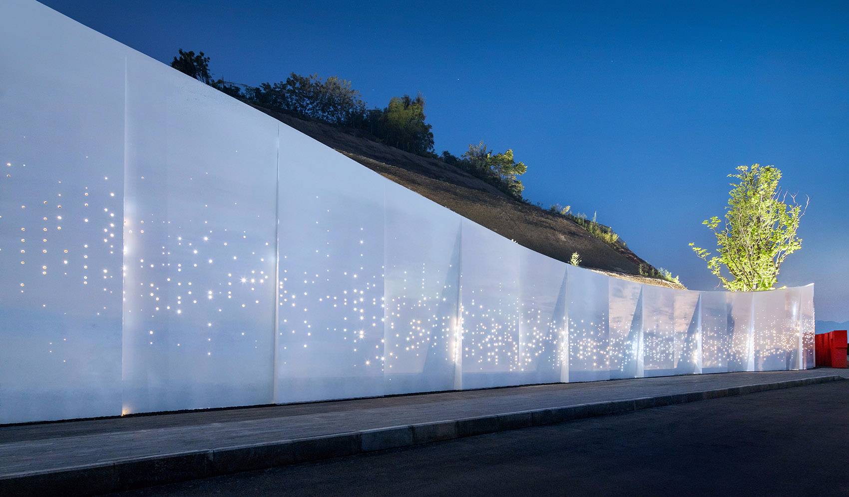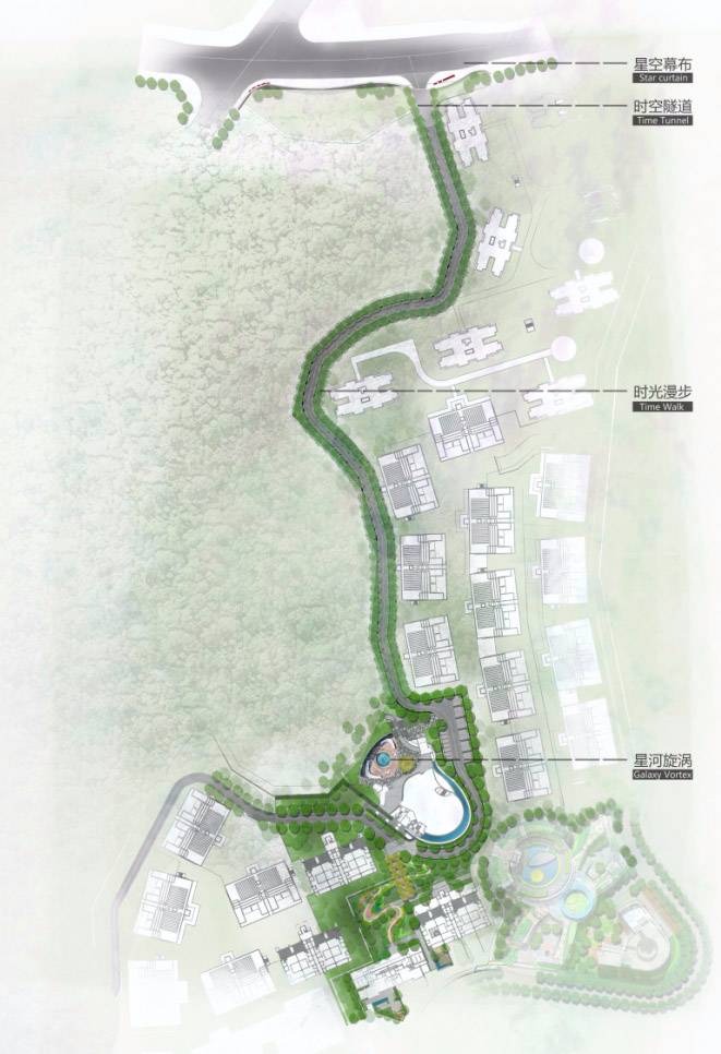 17英里示范區(qū)主入口的條件并非很好,道路未完善,修建馬路所形成的山體削坡成為了主入口一個(gè)“靚麗”的背景。沿著市政道路到入口150米長(zhǎng)的橫向空間,我們認(rèn)為更應(yīng)該從城市的角度去考慮它的展示面和呈現(xiàn)的氣質(zhì)。我們?cè)谶@里灑下環(huán)繞天空的銀白色環(huán)帶的銀河系星空幕布,夜幕降臨,璀璨和夢(mèng)幻將在這里上演。