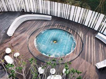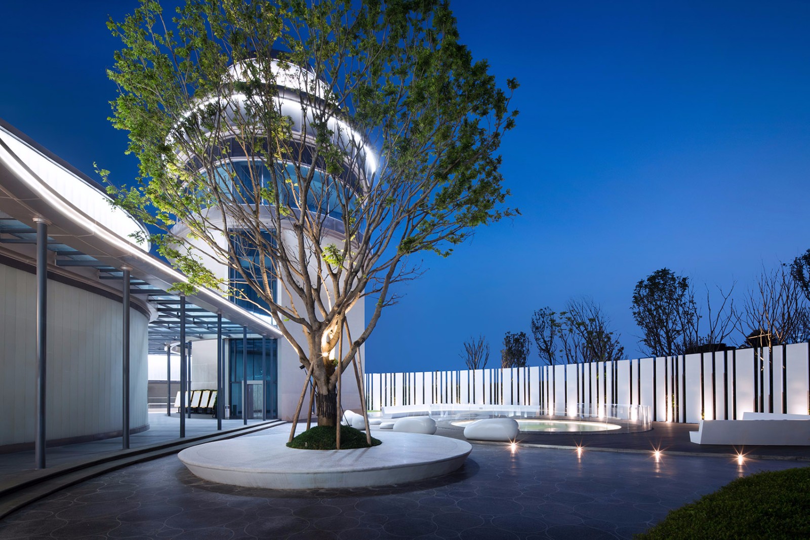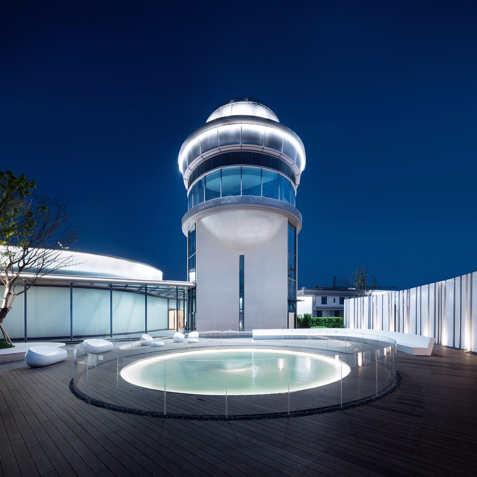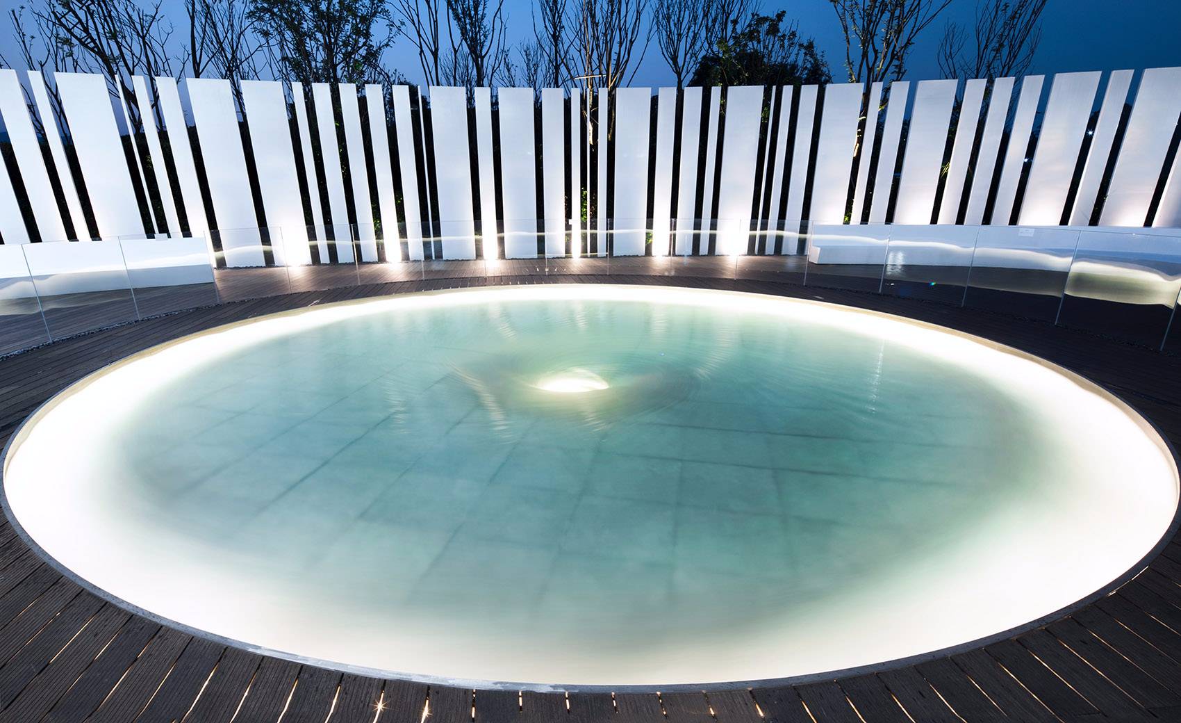 星河漩渦水景立在屋頂中心,通過(guò)內(nèi)置回流裝置形成一個(gè)巨大的水景漩渦,中心和邊界打上燈光,形成強(qiáng)烈的星空光暈。