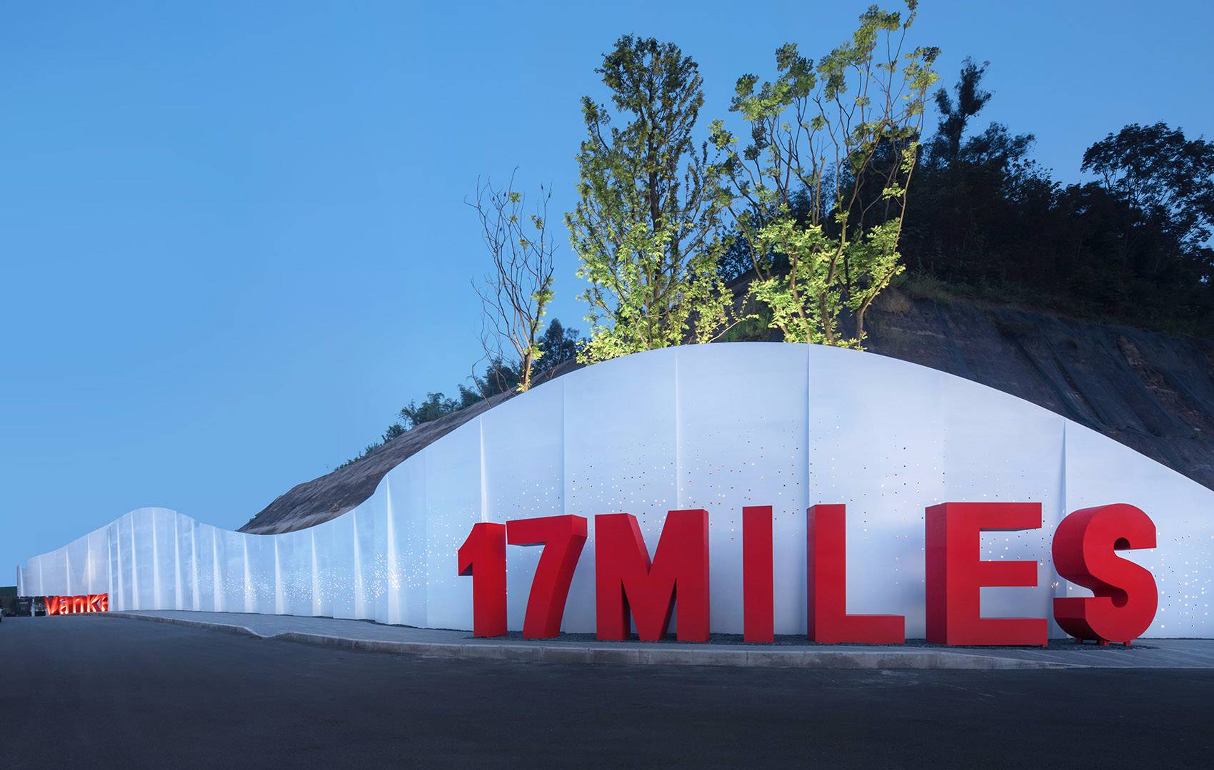 星空幕布豎向和橫向的尺度都超出一般人的尺度認(rèn)知,整體色彩以白色為基調(diào),因此我們希望面層的肌理應(yīng)該有更多層次的變化。在進(jìn)退關(guān)系上做了一些比較有意思的變化,橫向大界面則是一道瀟灑的白色銀河系星光,延展開來(lái),由三種大小不一樣、密度不一、排序不一的穿孔鋼板處理方式組合而成,形成一幅美妙的繁星閃耀的星空幕布。經(jīng)典的17MILES LOGO落于地面之上,簡(jiǎn)單大方,強(qiáng)化城市界面的空間滲透和入口的聚焦感撲面而來(lái)。