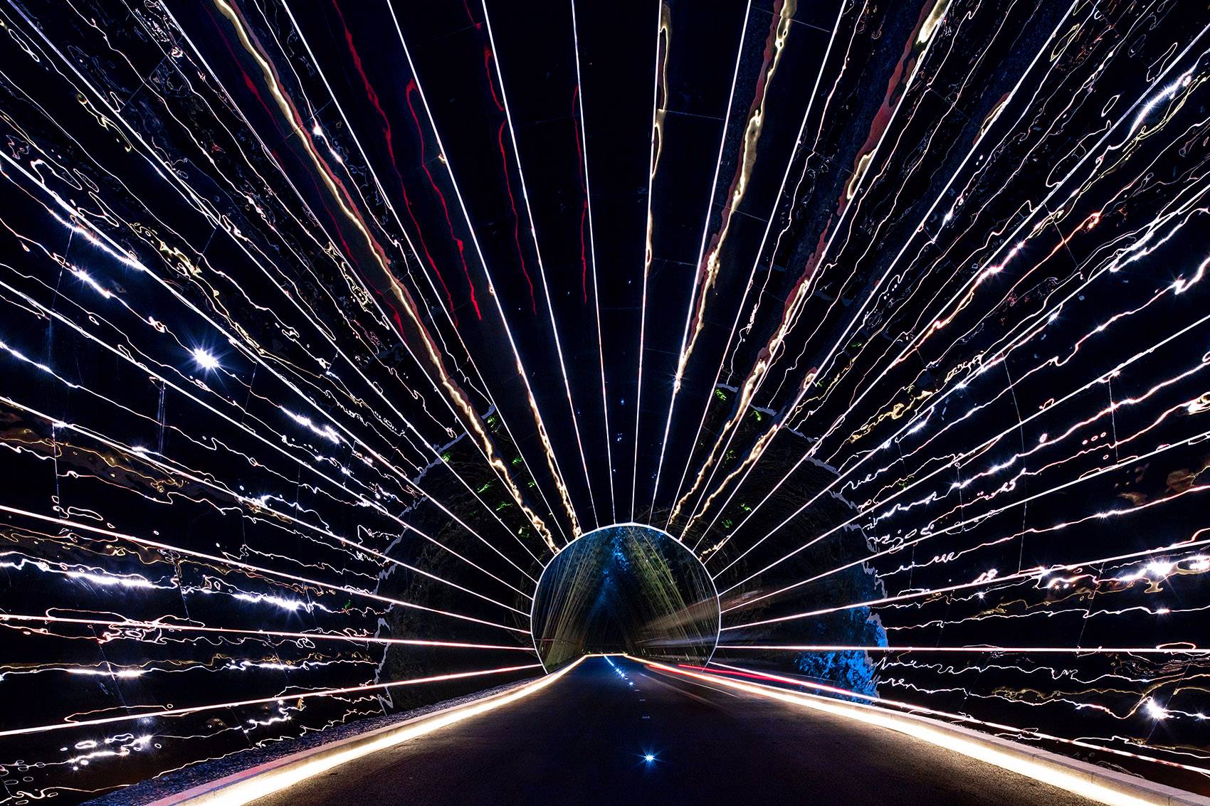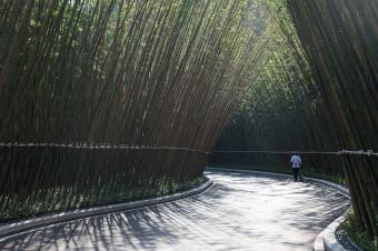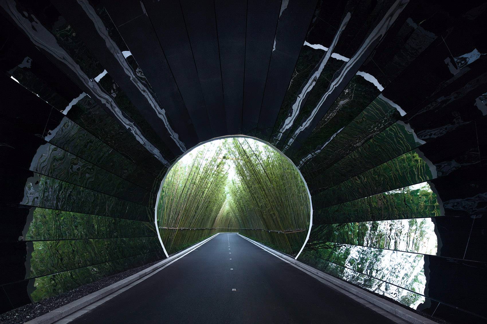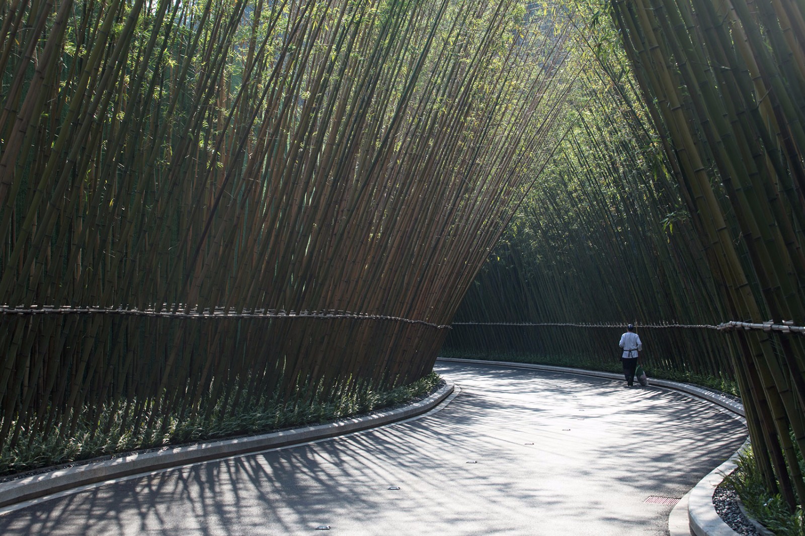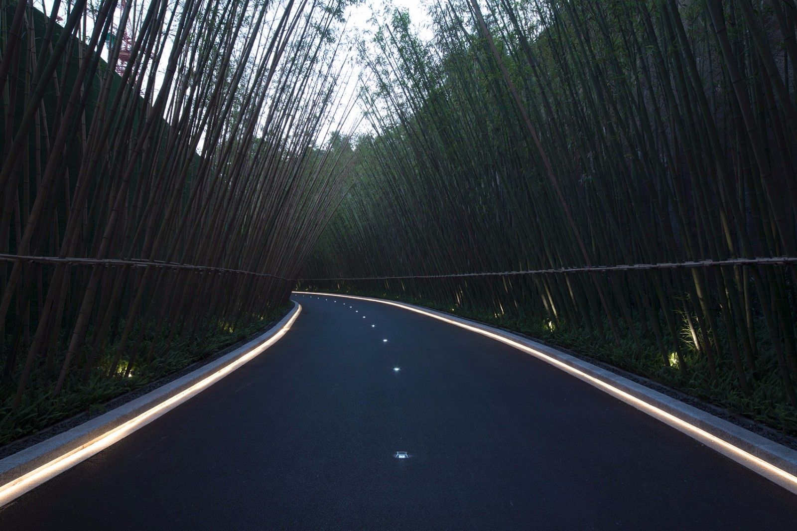 穿越過(guò)時(shí)空隧道,伴著蟲鳴鳥叫聲,徜徉在500米長(zhǎng)的竹林夾道。10萬(wàn)株9米高的楠竹,氣勢(shì)磅礴,迷霧四起,環(huán)繞于夾道之中。兩道溫潤(rùn)的光帶引導(dǎo)向前,繁星點(diǎn)點(diǎn)散落在竹林里,若隱若現(xiàn),剛勁有力的楠竹猶如士兵一樣規(guī)矩種植,簡(jiǎn)單干練。墨綠色的色彩彌漫在夾道空氣之中,此時(shí),仰望星空,猶如時(shí)光步道,如夢(mèng)如幻。