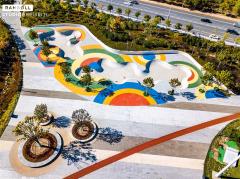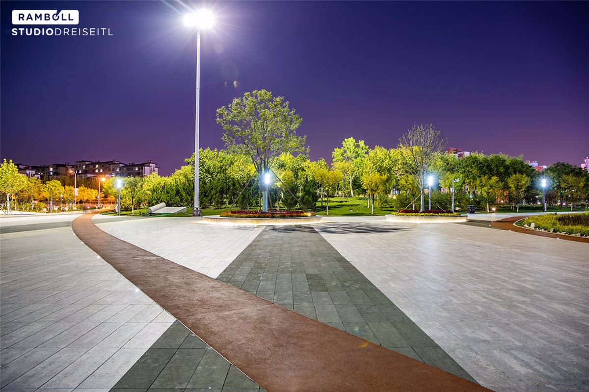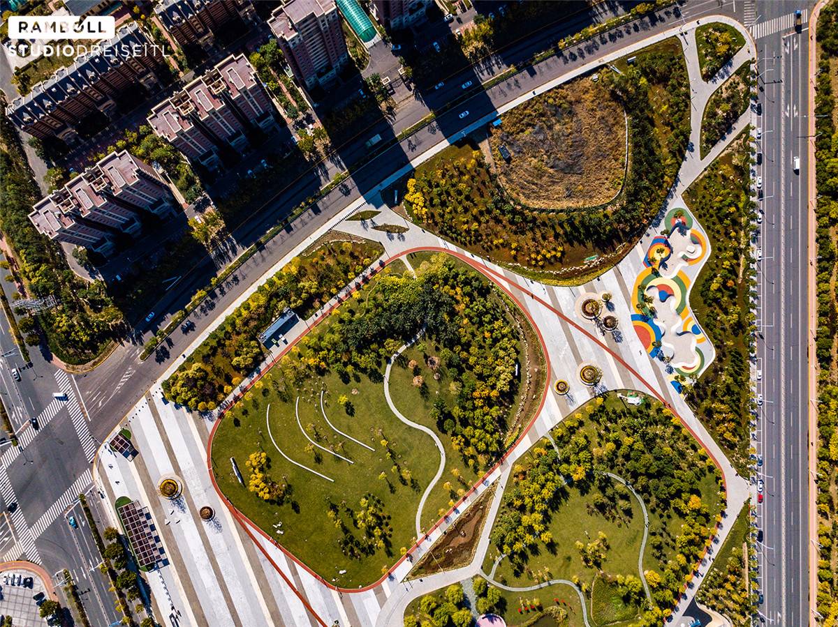 其形式和手法的運(yùn)用完全取決于周圍的環(huán)境和公園的整體定位。以“山濤”為基本立意展開設(shè)計(jì),在形式語(yǔ)言上,以模擬自然的山環(huán)水繞的造型特點(diǎn)為基礎(chǔ),水平空間上通過(guò)功能場(chǎng)地及鋪裝變化形成水波蕩漾的形態(tài),垂直空間上通過(guò)景觀微地形構(gòu)成山濤起伏的形態(tài),共同構(gòu)成自然的交響樂(lè)章。綠地使用與周邊用地相配合,城市與自然的立體更新,雨水花園,生態(tài)凈化群落和中心湖的設(shè)計(jì)充分發(fā)揮了公園的海
