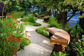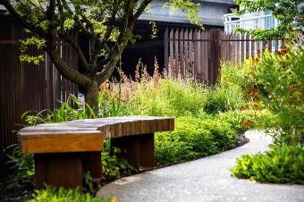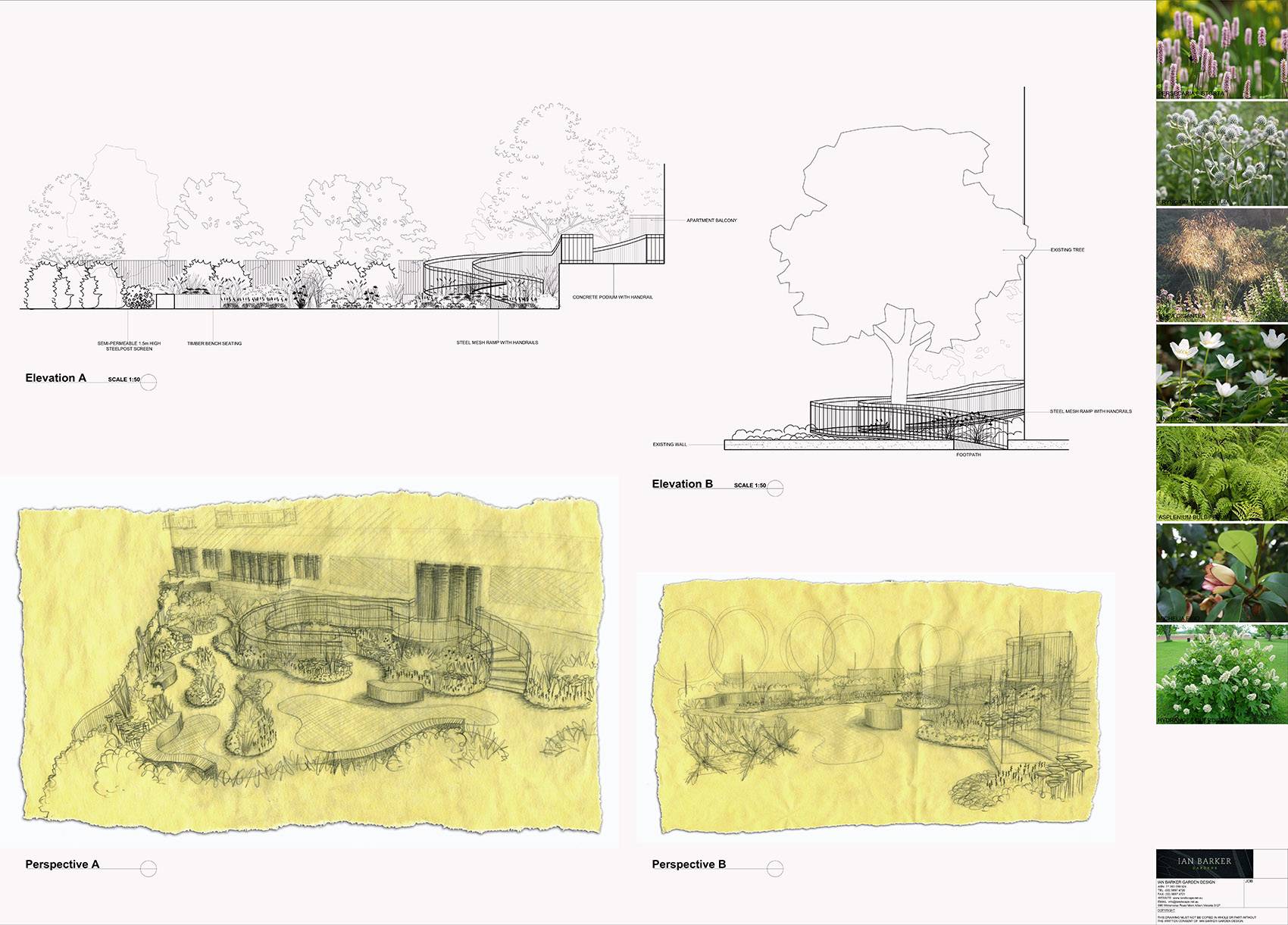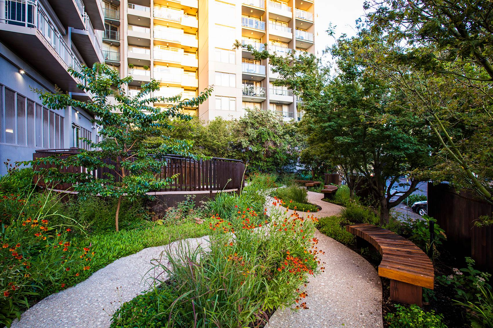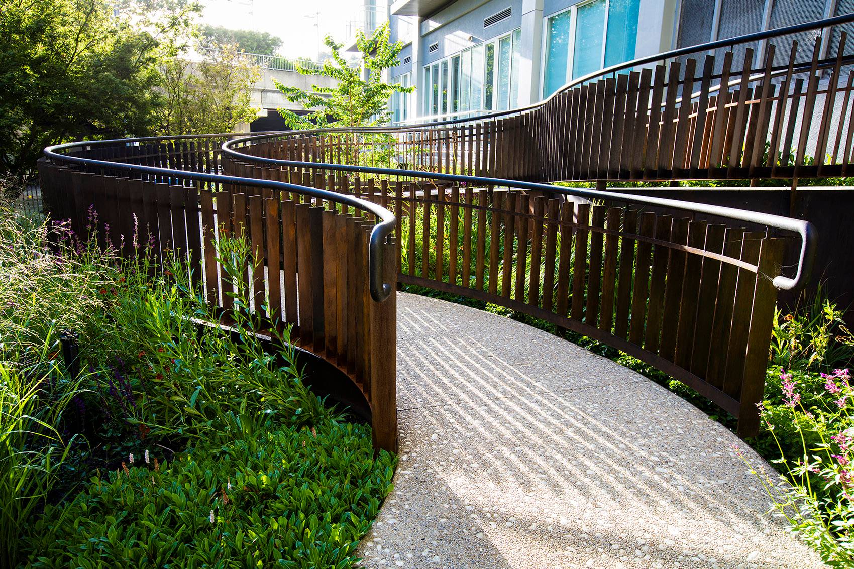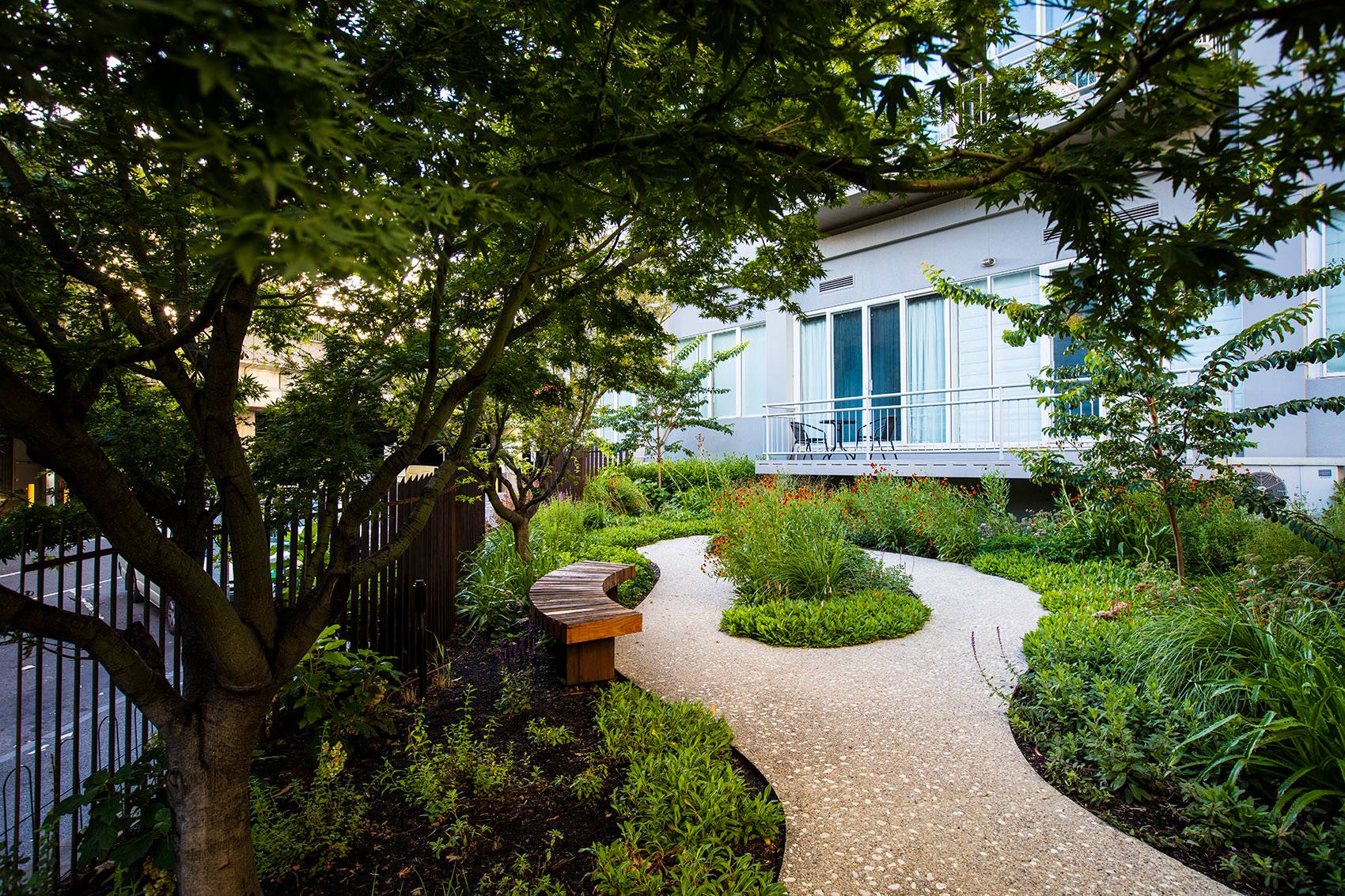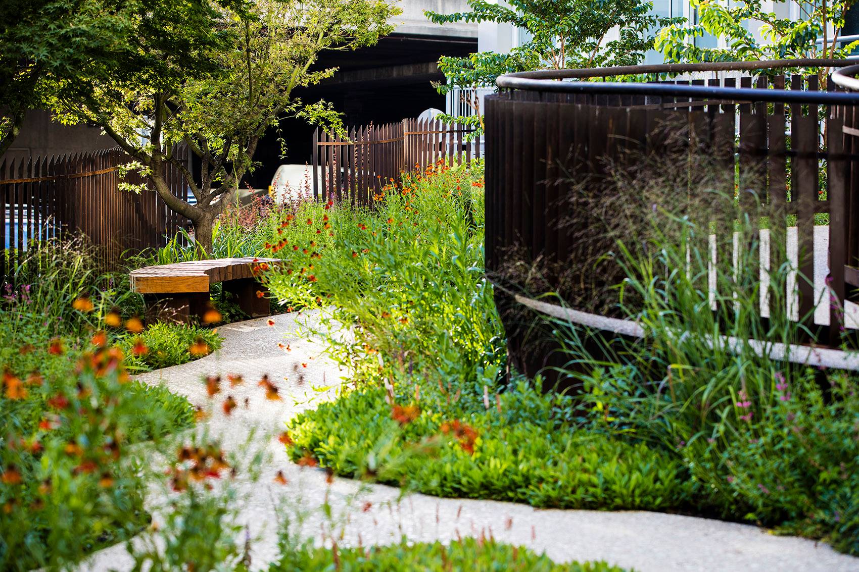 花園種植多種植物,同時(shí)設(shè)有木質(zhì)長(zhǎng)椅,混凝土矮墻,與居住公寓相連的混凝土步行道和樓梯,鋼結(jié)構(gòu)圍擋,及無障礙坡道。大量的多年生植物環(huán)繞花園主體空間種植,創(chuàng)造了輕松平靜的氛圍?;▓@位于地下停車場(chǎng)之上,有限的場(chǎng)地條件迫使設(shè)計(jì)師仔細(xì)斟酌綠植的選用。除此之外,設(shè)計(jì)師還需考慮在花園與街道之間設(shè)置綠林以保證花園的私密性。