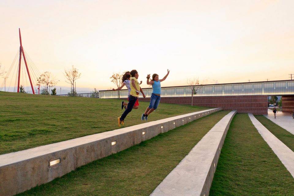 為了保護(hù)社區(qū)公園免受港口的影響,Sasaki創(chuàng)造了有力的雕塑感地形,將社區(qū)現(xiàn)有地平面升高到16英尺。該基地整合了一系列多功能的游樂場地,其中帶有點綴著遮蔭功能的草地緩坡。在該地形頂部,El Paseo散步大道提供了主要的步行通道,其間分布著座椅、展覽花園、以及一條人行和自行車共用道,與加利福利亞海岸道相連。