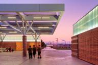 Sasaki在整個項目中融合了可持續(xù)性設(shè)計策略和創(chuàng)新性工程技術(shù)。雨洪管理將水引入主要的景觀區(qū),促進(jìn)滲透而不是流向市政污水處理;拆除的鋪面被回收再利用,用于鋪設(shè)底基層;所有的種植材料的選擇都考慮了生態(tài)適應(yīng)性,采用本土且耐鹽性強(qiáng)的、可用回收水灌溉的植被。建筑和基地照明突出了