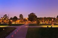 林蔭散步道擴(kuò)展了公園的步行散步系統(tǒng)和曲徑網(wǎng)絡(luò),并提供了多種多樣的座椅,供休息、冥想和觀看公園活動:包括互動水景、兒童探險游樂場、集會和表演廣場、以及樹林中的野炊活動。達(dá)頓步道提供了一條中心步行軸線,橫穿公園并連接兩個公園涼亭。涼亭建立了戶外房間框架,提供了各種非正式座椅、遮蔭、退讓區(qū)、公共衛(wèi)生間、和三個靈活的正式表演場地。