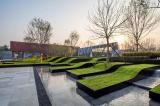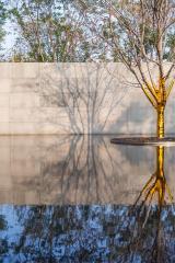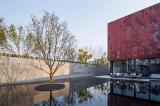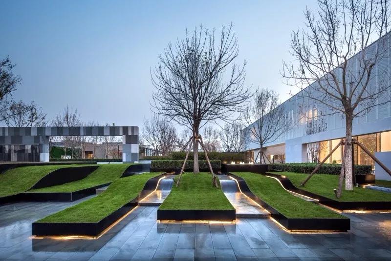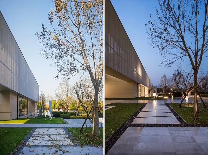 與雍祥府相對(duì),昆侖御建筑采用特色紋理穿孔銅板,顏色火熱、造型個(gè)性、空間封閉、充滿(mǎn)張力,給人很強(qiáng)的距離感。設(shè)計(jì)團(tuán)隊(duì)用植物柔化建筑“拒人以千里之外”的感受,樹(shù)陣和水景的序列感,加強(qiáng)了導(dǎo)向性,增強(qiáng)人們進(jìn)入的存在感和儀式感,平衡建筑的沖擊力。
