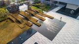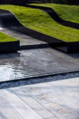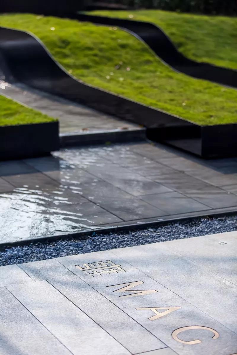 景觀引入“溪澗”概念,借鑒基地的“水”和工業(yè)元素,通過(guò)溪流的現(xiàn)代元素提取解構(gòu),采用鋼板工業(yè)材料,以大地藝術(shù)的手法將兩個(gè)彼此獨(dú)立沖突的建筑融合,使之整體統(tǒng)一又不失時(shí)尚美感,同時(shí)保證相互功能性的獨(dú)立。