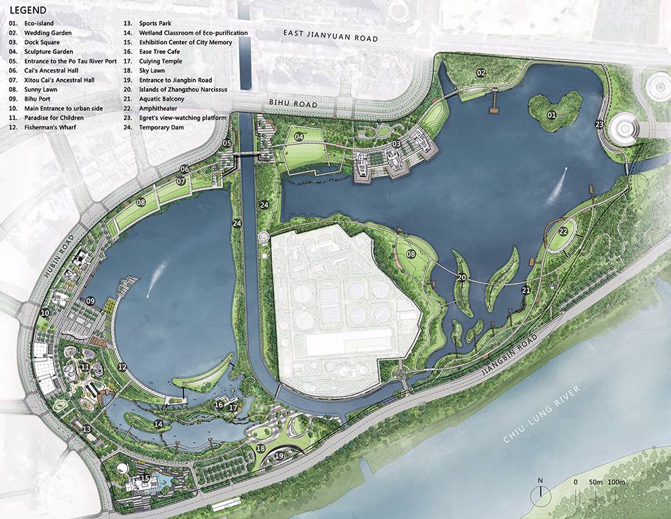 項(xiàng)目歷經(jīng)國(guó)際競(jìng)賽、城市規(guī)劃、景觀設(shè)計(jì)三個(gè)階段,客戶的要求是依托基地內(nèi)規(guī)劃的滯洪水體,建設(shè)城市級(jí)別的生態(tài)休閑水體公園,并通過(guò)公園周邊住宅和公共服務(wù)設(shè)施的開(kāi)發(fā)建設(shè),打造一個(gè)城市生活與自然山水環(huán)境交相輝映的城市生態(tài)園區(qū)。景觀設(shè)計(jì)師團(tuán)隊(duì)抓住這個(gè)機(jī)會(huì),設(shè)置生活水岸、文化水岸和生態(tài)水岸,三條水岸相互穿插滲透,共同構(gòu)建生態(tài)公園的功能構(gòu)架,并以水的形態(tài)將碧湖中東西兩邊公園用地聯(lián)系起來(lái),將各功能區(qū)域有機(jī)串聯(lián)。樹(shù)立城市新形象,使漳州完成從綠色濱江城市走向蔚藍(lán)濱海城市的轉(zhuǎn)型,實(shí)現(xiàn)功能拓展與區(qū)域統(tǒng)籌協(xié)調(diào),注重生態(tài)自然,實(shí)現(xiàn)經(jīng)濟(jì)發(fā)展與生態(tài)環(huán)保的共贏。