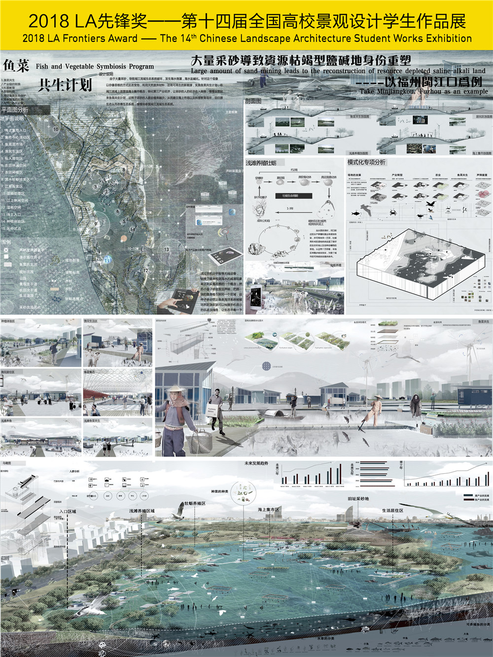 該場(chǎng)地位于閩江中下游的福州市閩侯縣境內(nèi)閩侯采沙場(chǎng)所在的區(qū)域,由于利益驅(qū)使,近二十年來(lái),閩江上出現(xiàn)了大大小小的非法采沙場(chǎng),采沙量與上游來(lái)沙量無(wú)法達(dá)到平衡,且采沙量仍有持續(xù)上升的趨勢(shì)。由于過(guò)度采沙, 造成河床下沉,使得閩江下游河道納潮容積大幅擴(kuò)大, 給潮水侵入創(chuàng)造了條件。潮侵給閩江生態(tài)環(huán)境帶來(lái)嚴(yán)重威脅。該設(shè)計(jì)計(jì)劃通過(guò)創(chuàng)造出一個(gè)魚菜共生的系統(tǒng),降低該區(qū)域江水的鹽度,以菜凈水、 以水養(yǎng)魚、 以魚種菜的生態(tài)循環(huán)模式,實(shí)現(xiàn)了魚類、與植物與自然的和諧共生,一方面增加漁民收入外,一方面凈化養(yǎng)殖水環(huán)境,另一方面吸引游客過(guò)來(lái)種植,捕魚等野外的互動(dòng)體驗(yàn)的科普教育模式。保障養(yǎng)殖水域安全和養(yǎng)殖水產(chǎn)品質(zhì)量安全,提高池塘養(yǎng)殖綜合效益,有效的利用池塘水面,節(jié)約耕地,增加市場(chǎng)蔬菜供應(yīng),在穩(wěn)定農(nóng)產(chǎn)品價(jià)格方面起到了一定的作用;為福州特色效益漁業(yè)發(fā)展探索出了一條新路徑,促進(jìn)第三產(chǎn)業(yè)的轉(zhuǎn)化,將場(chǎng)地原有的采沙業(yè)轉(zhuǎn)化為養(yǎng)殖業(yè)和種植業(yè),改善場(chǎng)地環(huán)境,修復(fù)生態(tài)。