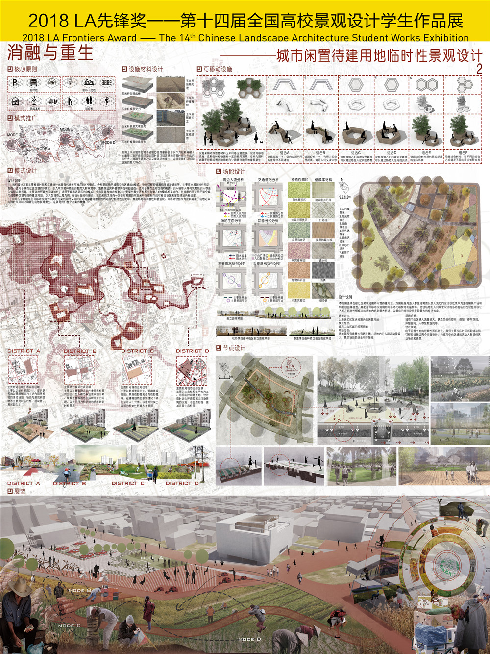 我們?cè)O(shè)計(jì)方案主要根據(jù)時(shí)間和區(qū)域設(shè)計(jì)出具有代表性可推廣的4種模式。分別是適用于城市中心區(qū)域的A模式,設(shè)計(jì)可移動(dòng)設(shè)施和可拆卸鋪裝等,主要突出其臨時(shí)性和功能性;適用于城市過(guò)渡區(qū)域的B模式,引入農(nóng)作物種植吸引都市人群觀賞等,主要突出其科普教育性和舒適性;適用于城市近郊區(qū)的C模式,引入稻草人等構(gòu)筑物吸引人群進(jìn)入體驗(yàn)農(nóng)耕樂(lè)趣,主要突出野趣性和體驗(yàn)性;適用于城市遠(yuǎn)郊區(qū)的D模式,生態(tài)改善種植農(nóng)作物,主要突出其生產(chǎn)性和生態(tài)型。4種模式相互組合、拼接最后可適用于整個(gè)城市的每種區(qū)域內(nèi)的待建設(shè)用地。模式中可移動(dòng)設(shè)施采用有玉米桿壓縮制作,具有一定的使用期限??梢苿?dòng)設(shè)施作為肥料消融于閑置土地中的同時(shí),在對(duì)環(huán)境無(wú)污染的情況下,又可以使閑置土地獲得重生。