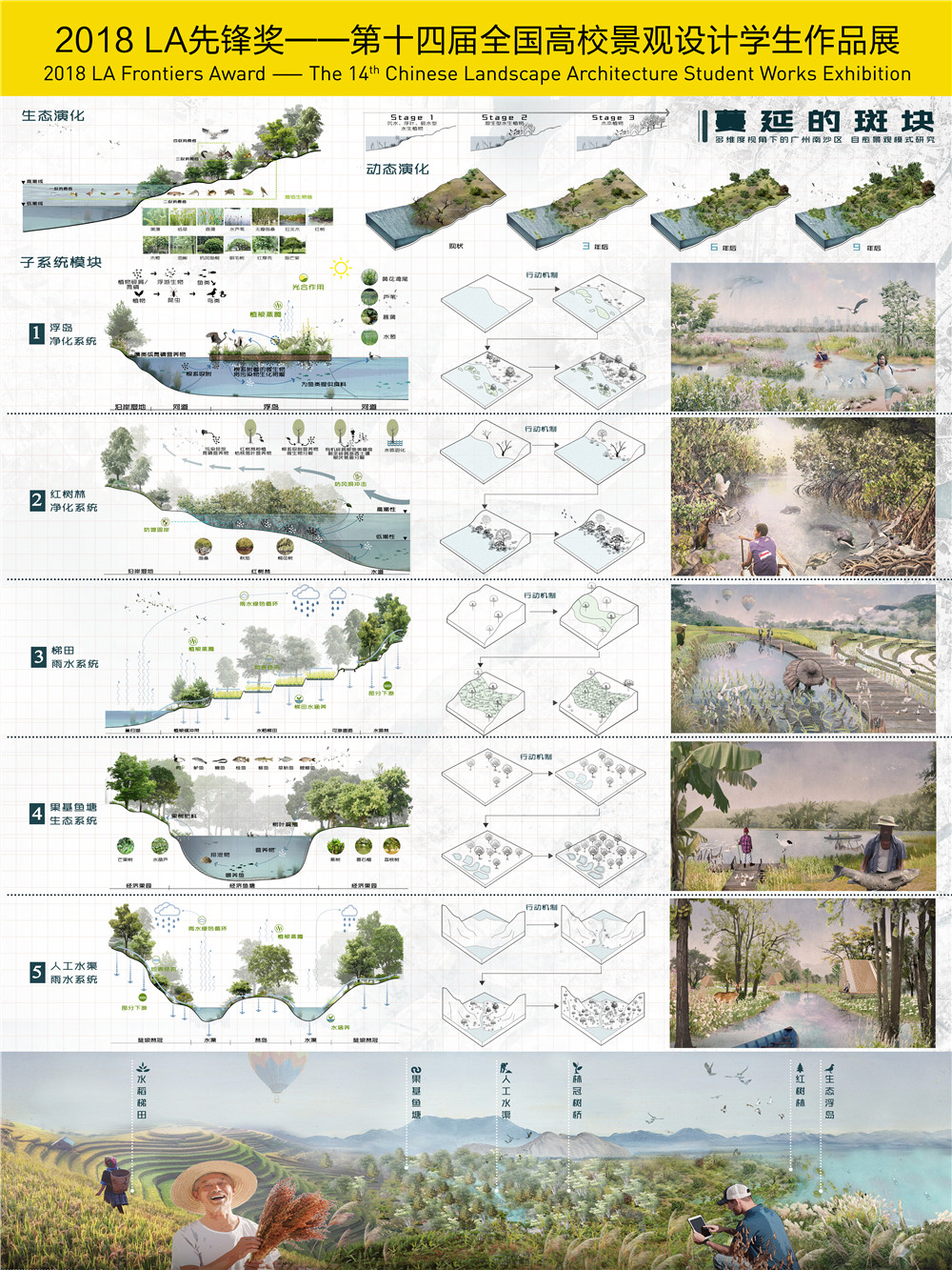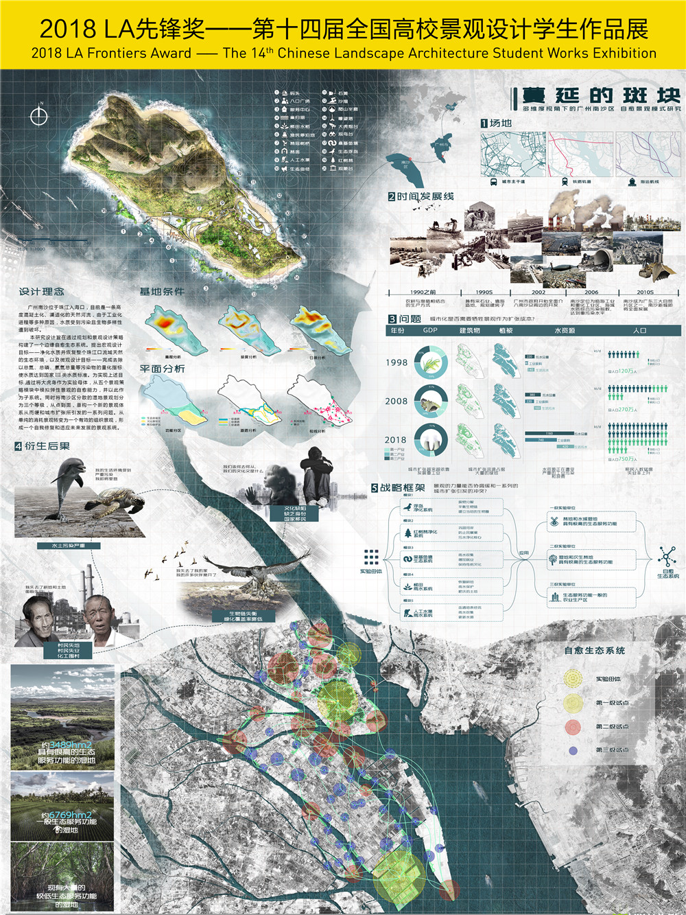 廣州南沙位于珠江入???,目前是一條高度混凝土化、渠道化的天然河流,由于工業(yè)化進程等多種原因,水質(zhì)受到污染且生物多樣性遭到破壞。本研究設(shè)計旨在通過規(guī)劃和景觀設(shè)計策略構(gòu)建了一個邊緣自愈生態(tài)系統(tǒng)。提出宏觀設(shè)計目標——凈化水質(zhì)并恢復(fù)整個珠江口流域天然的生態(tài)環(huán)境,以及微觀設(shè)計目標——完成去除以總氮、總磷、氨氮總量等污染物的量化指標,使水質(zhì)達到國家III類水質(zhì)標準。為實現(xiàn)上述目標, 通過將大虎島作為實驗?zāi)阁w,從五個景觀策略模塊中模擬彈性景觀的自愈能力,并以此作為子系統(tǒng)。同時將南沙區(qū)分散的濕地景觀劃分為三個等級,從點到面,重構(gòu)一個新的景觀體系,從而緩和城市擴張所引發(fā)的一系列問題。從單純的消耗景觀轉(zhuǎn)變?yōu)橐粋€有效的組織景觀,形成一個自我修復(fù)和適應(yīng)未來發(fā)展的景觀系統(tǒng)。