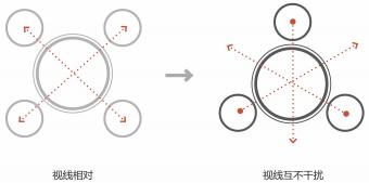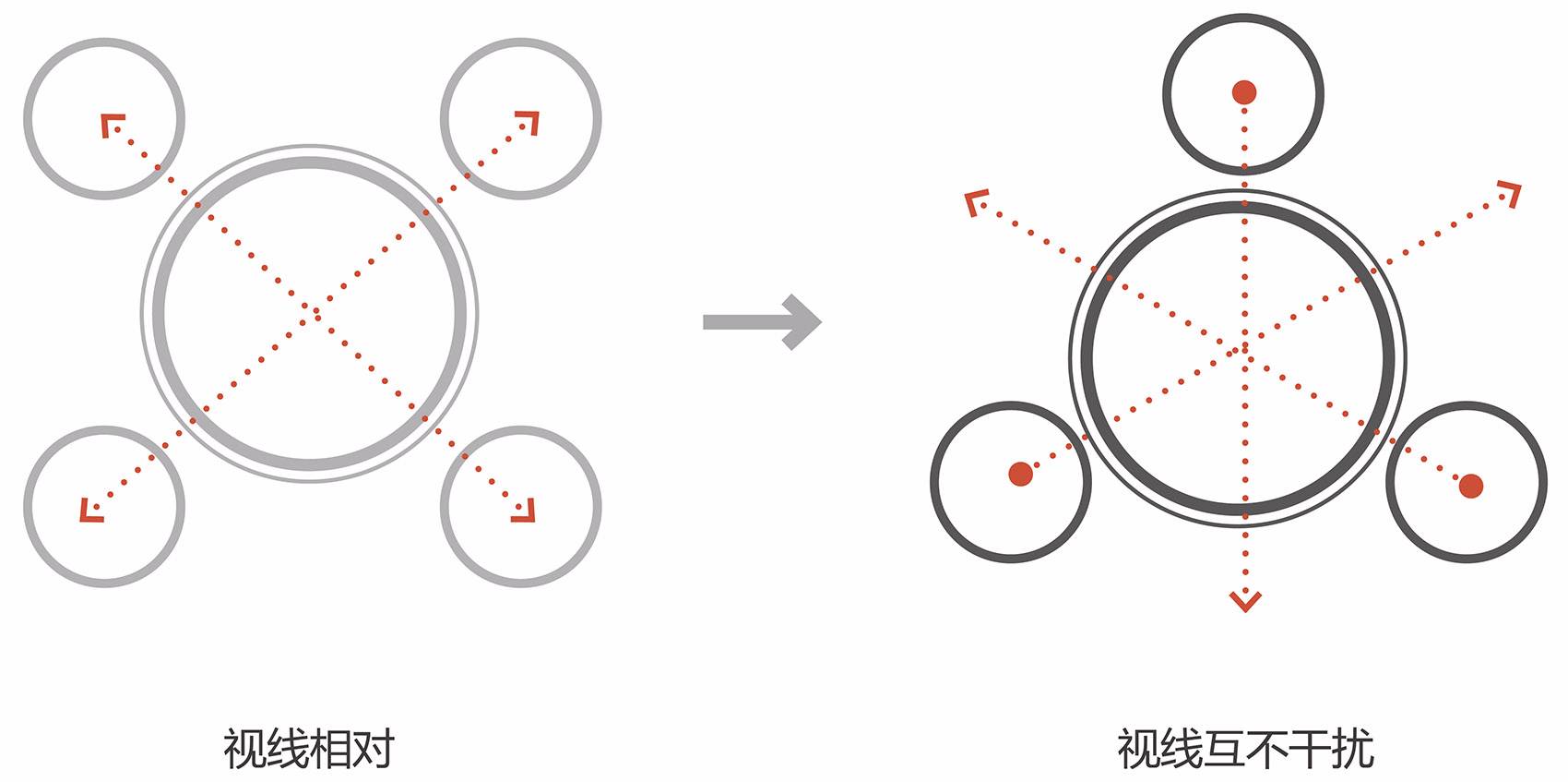 交流休閑模塊主要為老年人提供戶外觀景、交談的場(chǎng)所,在好友、家屬探訪時(shí),提供一個(gè)環(huán)境優(yōu)美、安靜舒適的交流空間。座椅采用三角形方式擺設(shè),避免了視線的直接相撞,提高交談的舒適度,又可看到其他區(qū)域的景觀。