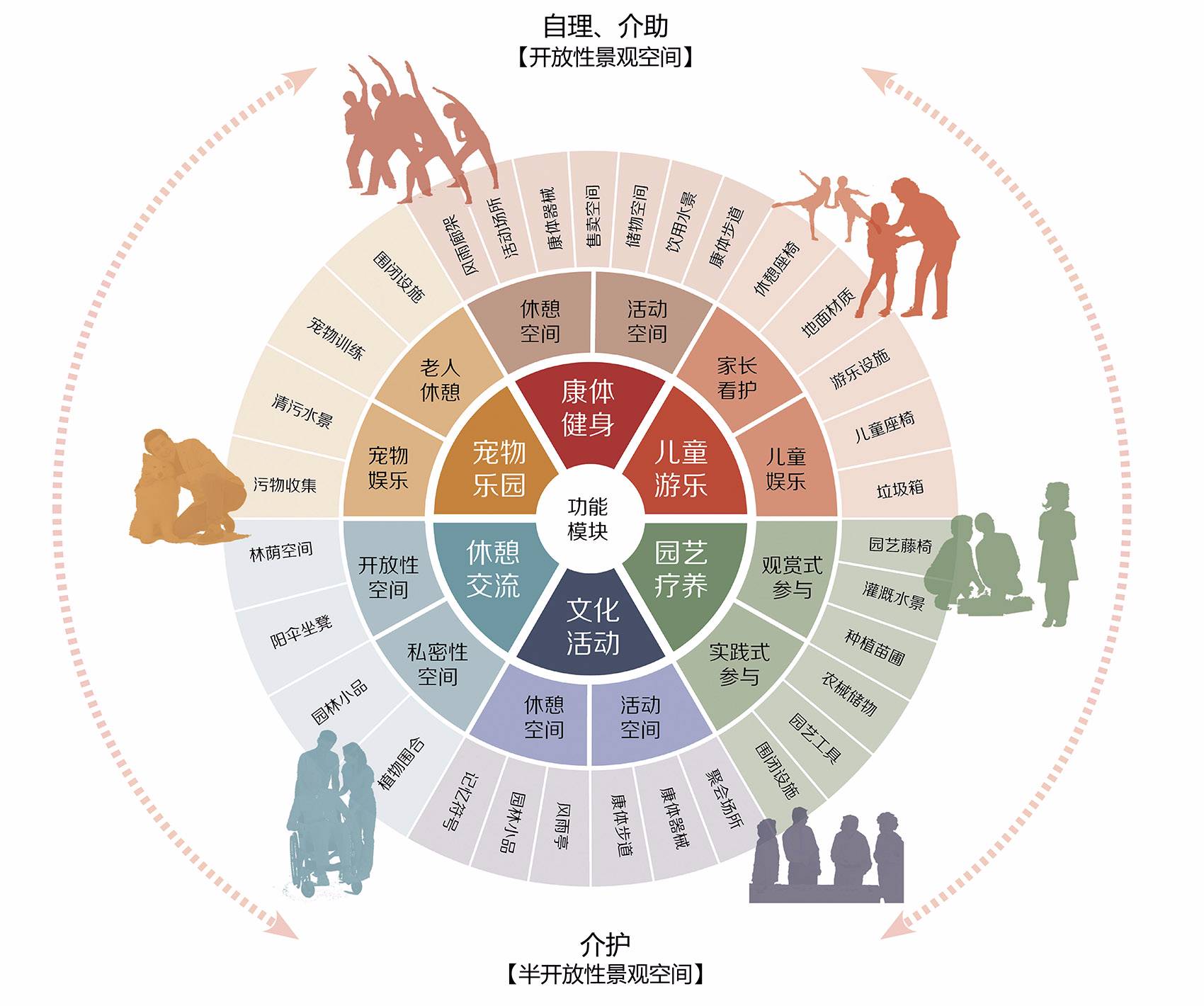 在歸納各類老人的活動(dòng)需求及所需設(shè)施配置后,總結(jié)并構(gòu)建了適宜各類老年人日?;顒?dòng)功能的六大主要模塊:康體健身、園藝療養(yǎng)、休憩交流、兒童游樂、寵物樂園、文化活動(dòng)。在實(shí)際運(yùn)用時(shí),設(shè)計(jì)團(tuán)隊(duì)再根據(jù)項(xiàng)目的實(shí)際需求,靈活的選取各功能模塊、配套設(shè)施進(jìn)行組合。