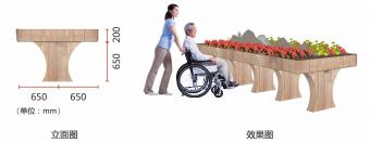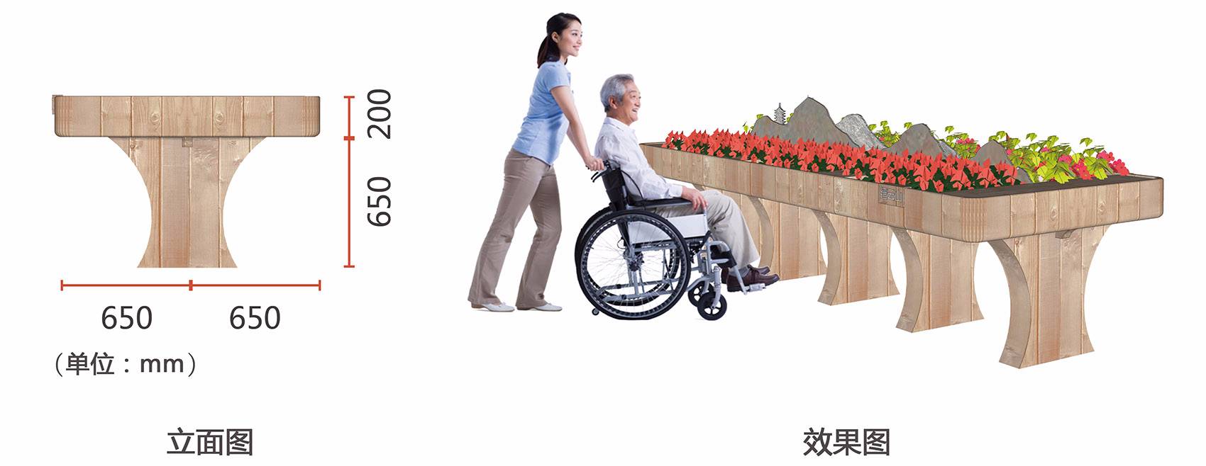設(shè)計(jì)團(tuán)隊(duì)仔細(xì)研究了種植池的尺寸,保證坐輪椅的老人也能在種植池上自如的操作。種植池底部距離地面0.65m,讓輪椅老人雙腿剛好放入種植池底部空間;為了讓坐輪椅的老人同時(shí)在種植池兩側(cè)展開園藝活動(dòng),促進(jìn)老年人的交流,設(shè)計(jì)團(tuán)隊(duì)特意加寬了種植池的寬度。