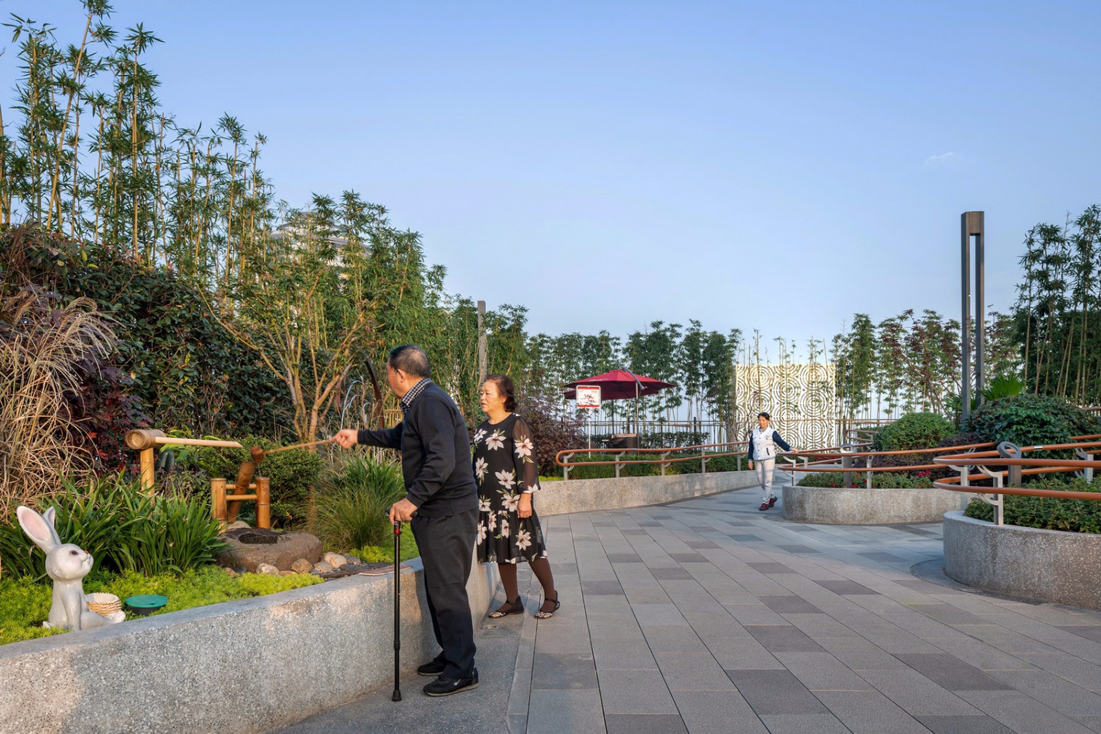 灌溉水景既為點(diǎn)景,也提供了水源供老人們與自然互動(dòng)。老人們可在此松土,修剪黃葉子,澆水,對(duì)話,過程中得以鍛煉肢體力量,愉悅身心。
