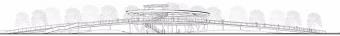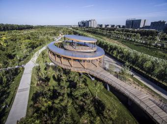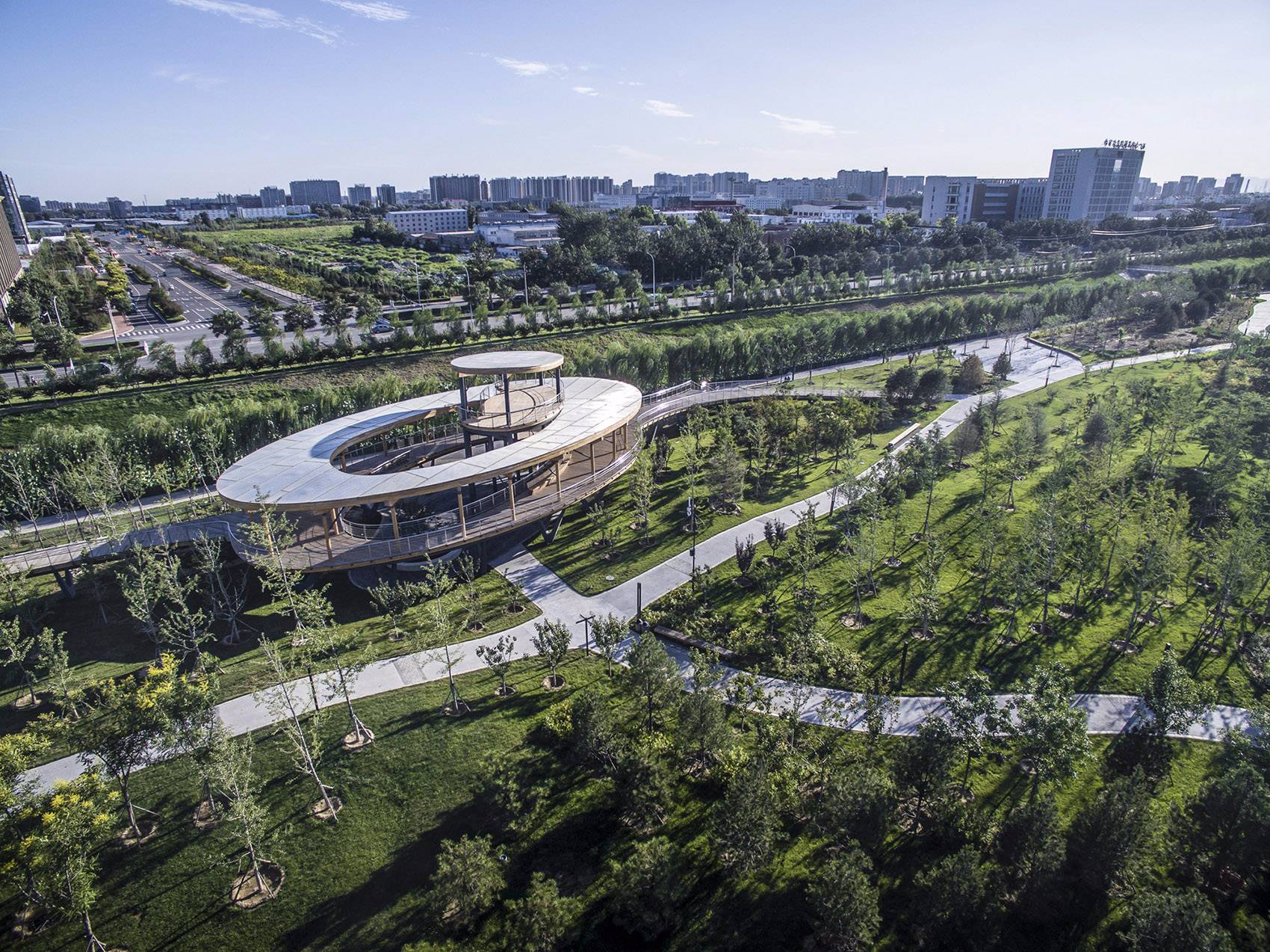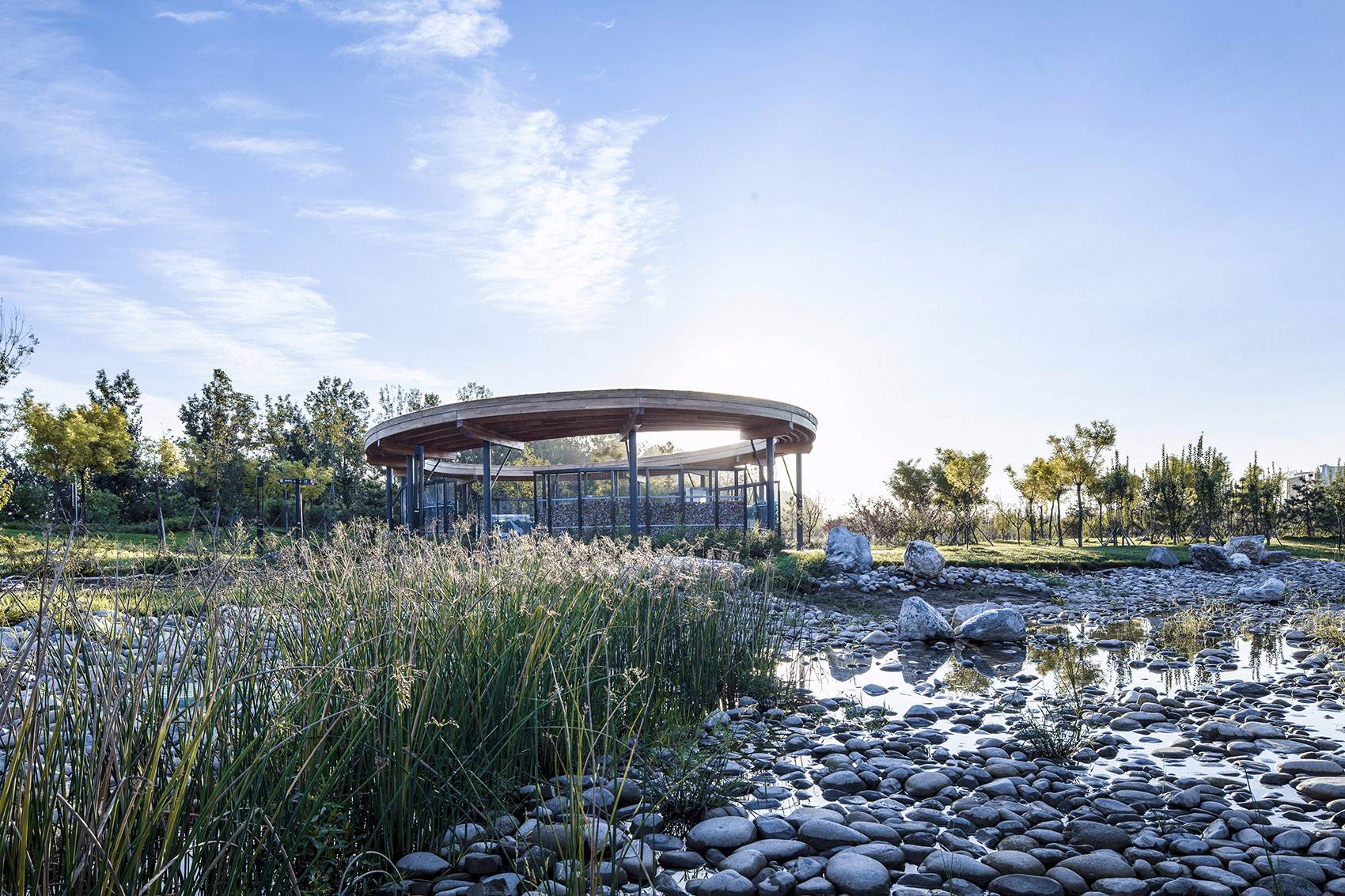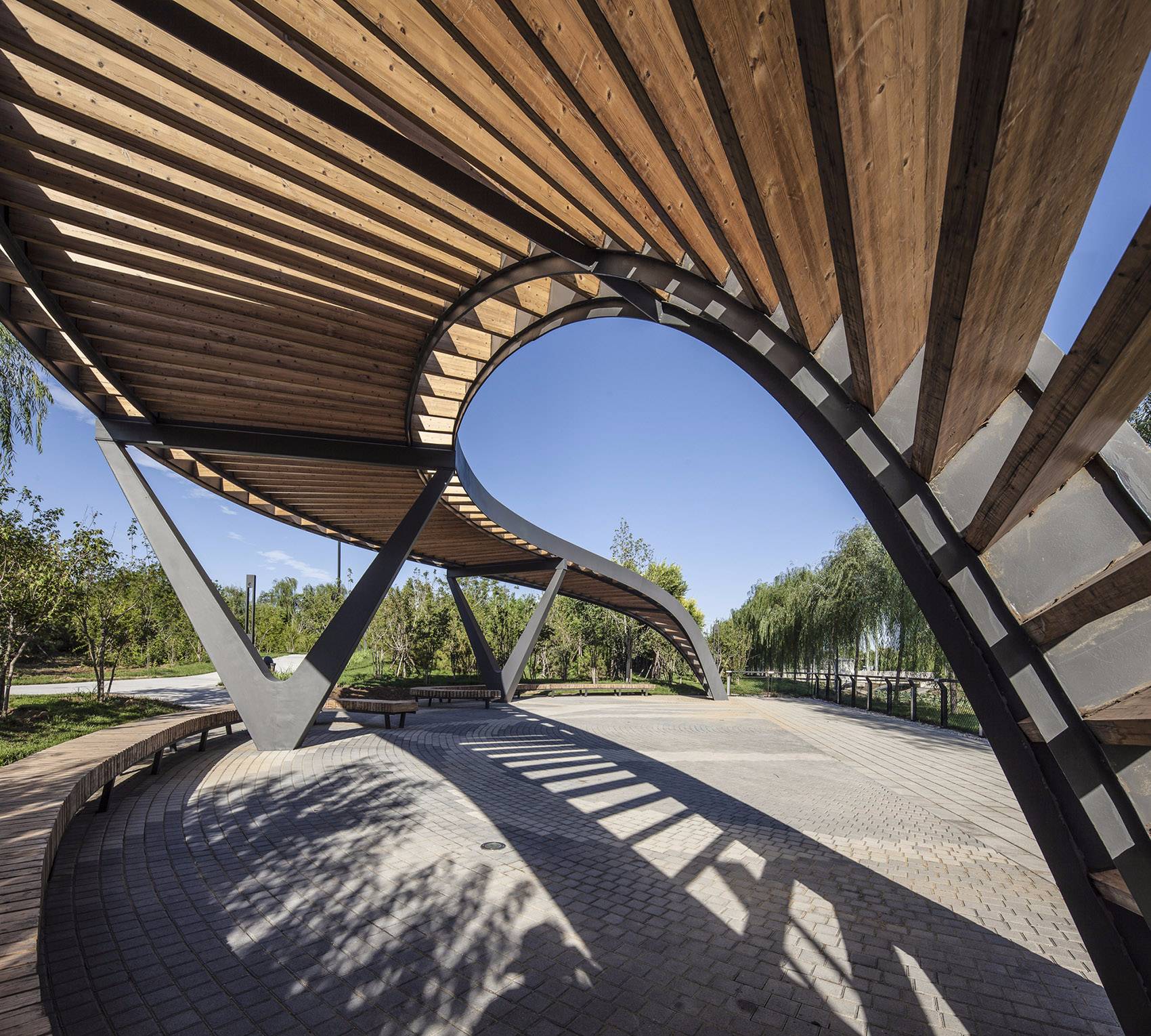 經(jīng)過中部知行足下園和樹?紀(jì)念廣場進(jìn)入奮進(jìn)園。奮進(jìn)園是生態(tài)文明教育公園的尾聲,通過奮進(jìn)林地等場所營造,再現(xiàn)大興區(qū)生態(tài)文明實踐的歷程。位于奮進(jìn)園內(nèi)的貫虹廊,是圓拱造形的特色鋼木結(jié)構(gòu)休息廊。貫虹廊起始線與終點線均與河岸和防汛通通平行,雙向彎曲的廊身由兩根彎曲的鋼梁和它們之間的木構(gòu)連接件組成,支撐結(jié)構(gòu)也如翠波廊橋之Y型鋼柱。寧靜而展翅欲飛造型,象征和諧也寓意騰飛。貫虹廊與翠波廊橋同在二級生態(tài)路北側(cè),分別處在新媒體基地次干道廣平大街的北端延伸點和主干道廣陽大街北端延伸點。這一排列使它成為新媒體基地的重要景觀界,同時面向城鄉(xiāng)結(jié)合部地區(qū)蒸蒸日上的生態(tài)文明建設(shè)和城市化發(fā)展區(qū)域,飛動的形態(tài)具極強的象征意義。