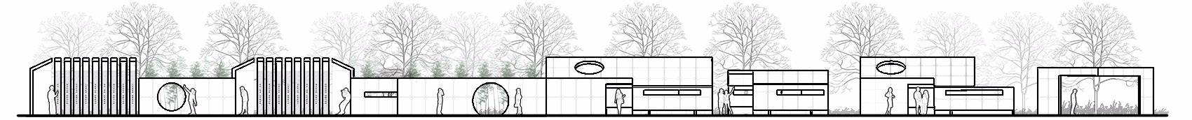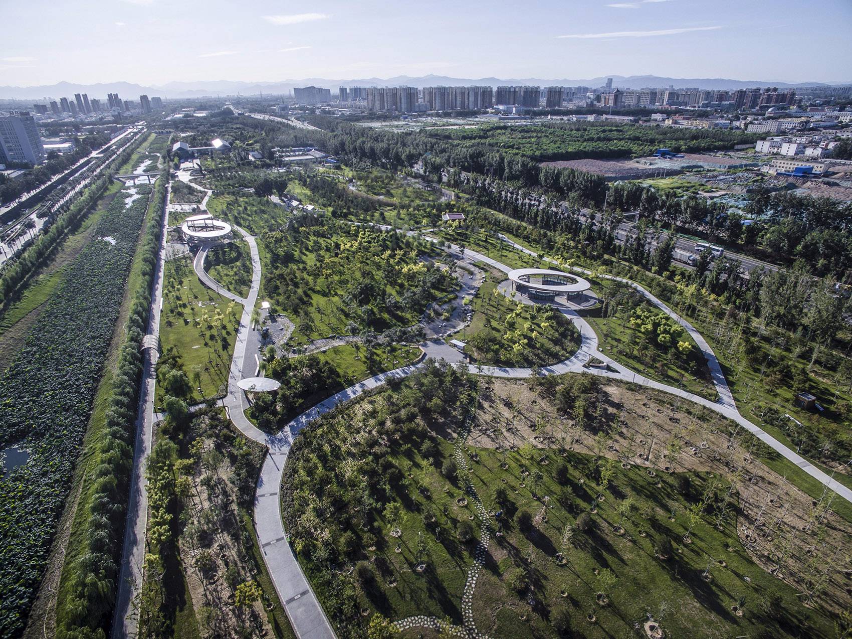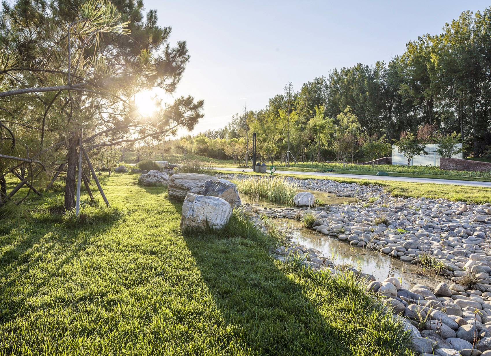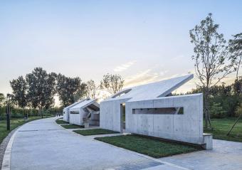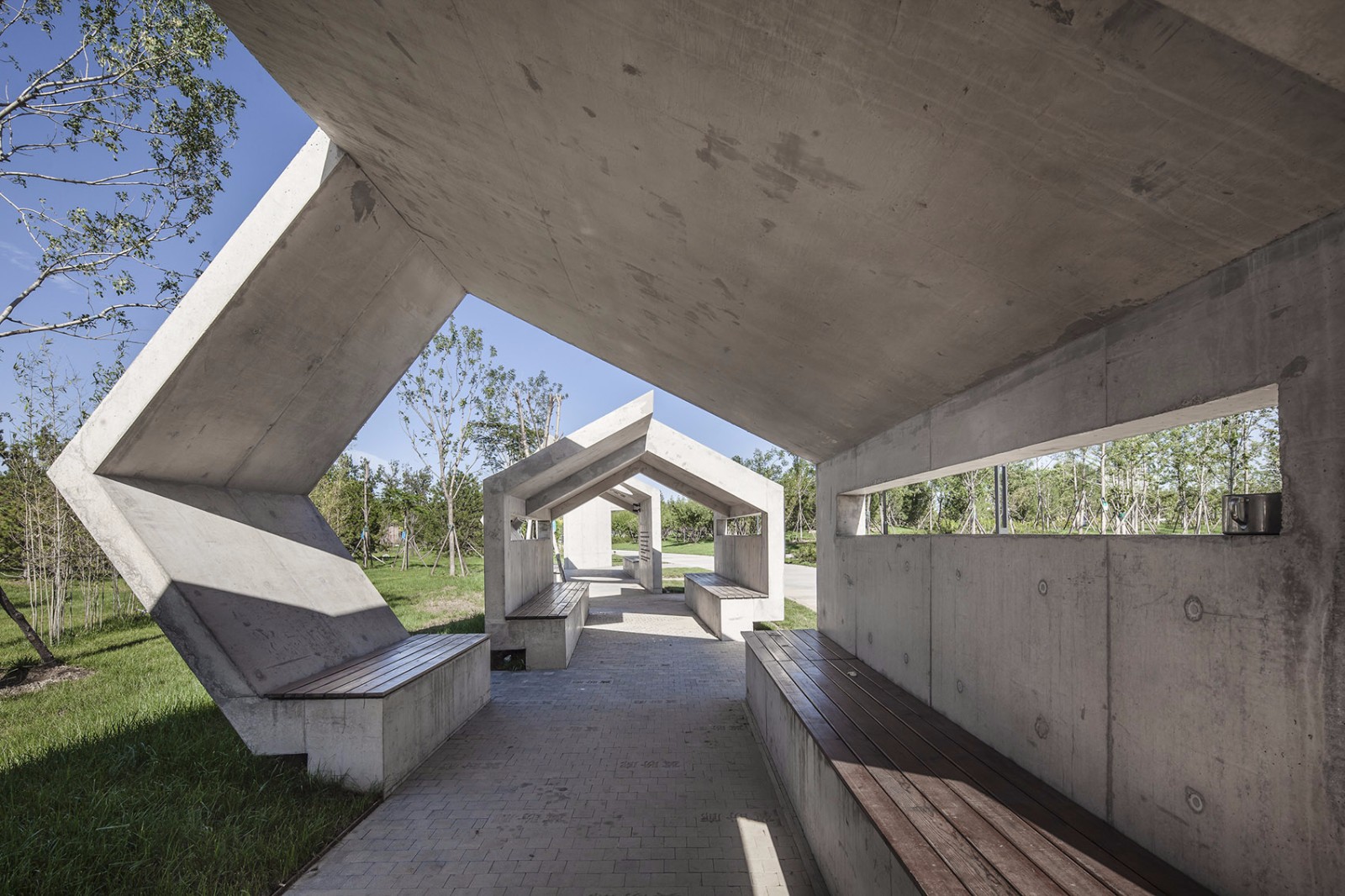 建造在城鄉(xiāng)結(jié)合部騰退還綠區(qū)域中的大興生態(tài)文明教育公園以線性敘事結(jié)構(gòu);以當(dāng)代樸素簡約的空間塑造手段;完成游園職能和啟迪性升華。以灰建筑名義的構(gòu)筑物群積極參與了場所敘事,其陳述內(nèi)容(意義)及陳述內(nèi)容的形式介質(zhì)(型和材料)所構(gòu)成的敘事修辭嘗試以更開放、抽象、樸素和純粹的方式。這既構(gòu)建了主題敘事框架下的邏輯和序列,又營造了歡愉浪漫的觀景體驗和美學(xué)享受。