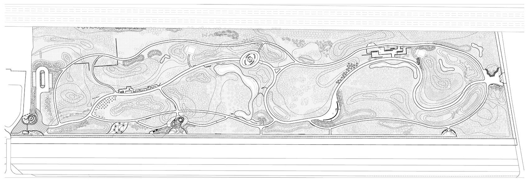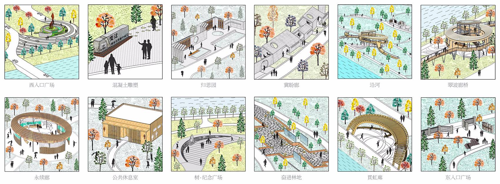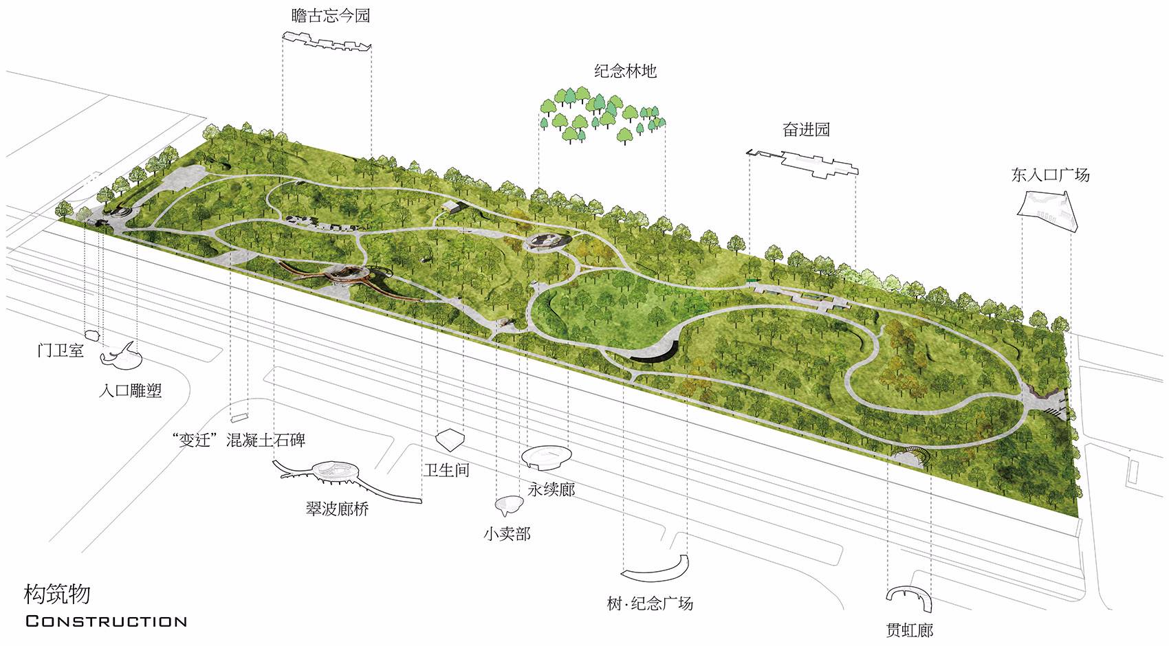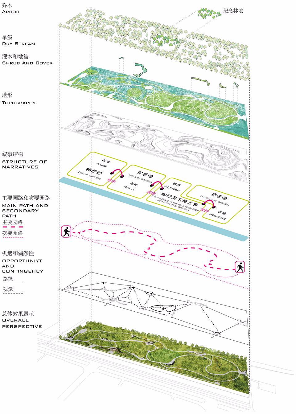 公園自西向東按敘事邏輯編排了四個關(guān)聯(lián)景園,分別命名為暢想園、智慧園、知行足下園和奮進(jìn)園,呈現(xiàn)了從“自然暢想”、“普及引導(dǎo)”、“教育紀(jì)念”“努力踐行”的線性遞進(jìn)關(guān)聯(lián),并分別由一條一級園路和一條環(huán)形生態(tài)步道貫通。這一線性敘事方式如膠片所展現(xiàn)的連續(xù)影像空間,又如一幅園林畫手卷,既平實連貫具線性敘事關(guān)聯(lián),也結(jié)合靜止或動態(tài)敘事場所設(shè)計,增加體驗和審美,引導(dǎo)思考。正如敘事暗示著“通過行為和體驗的偶然性來獲得知識的方式”(馬修,p3),隱藏在敘事結(jié)構(gòu)和場所后的意義被片段、巧合或偶遇,暗示性地揭示出來,引發(fā)游覽者內(nèi)心自發(fā)的認(rèn)識、理解、整合及至共鳴,而不是試圖“尋找普遍真理”(馬修,p4)。