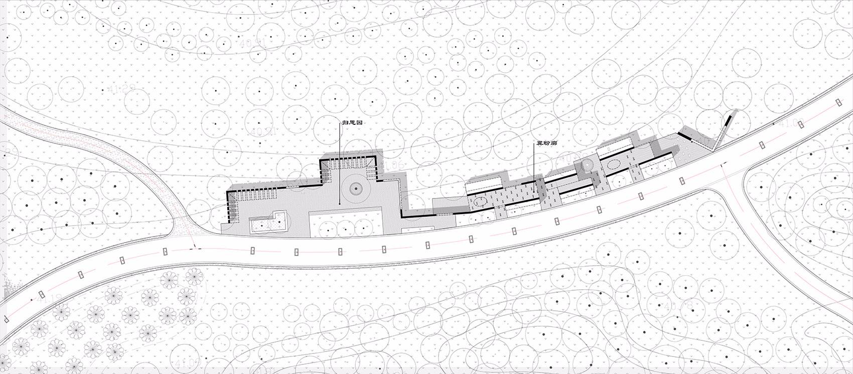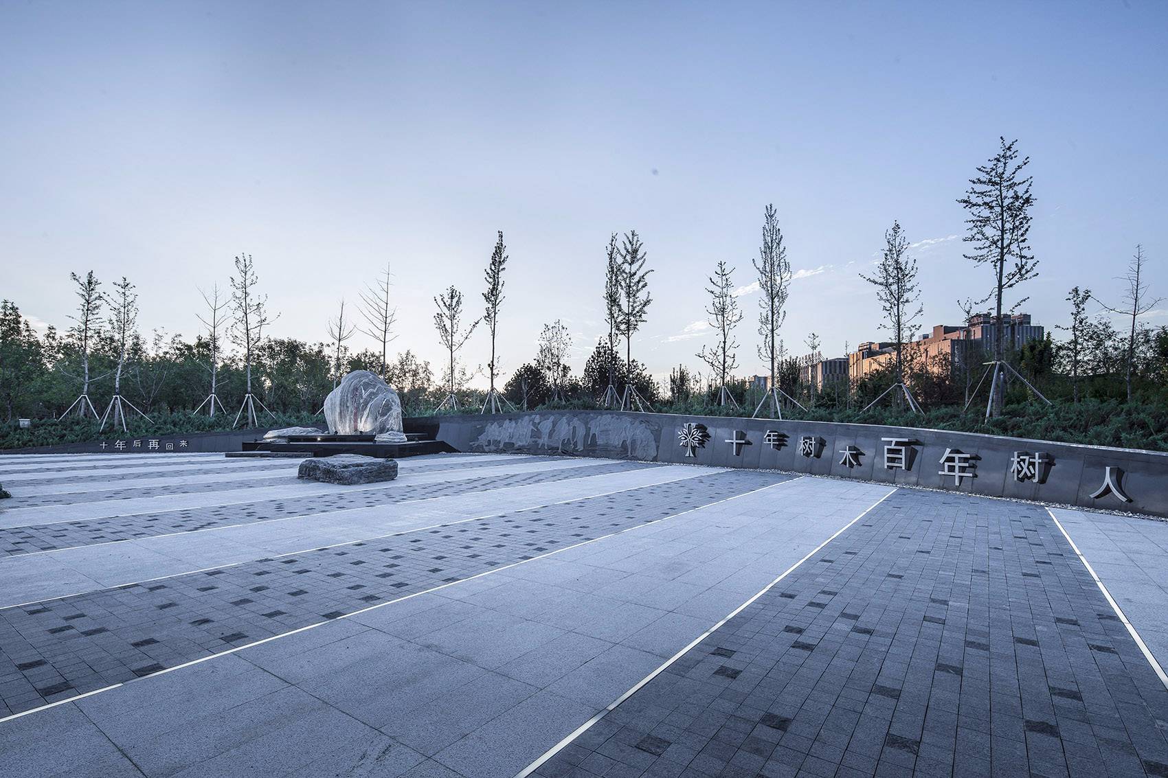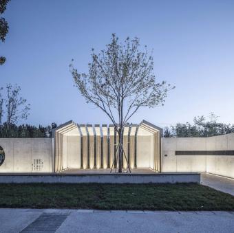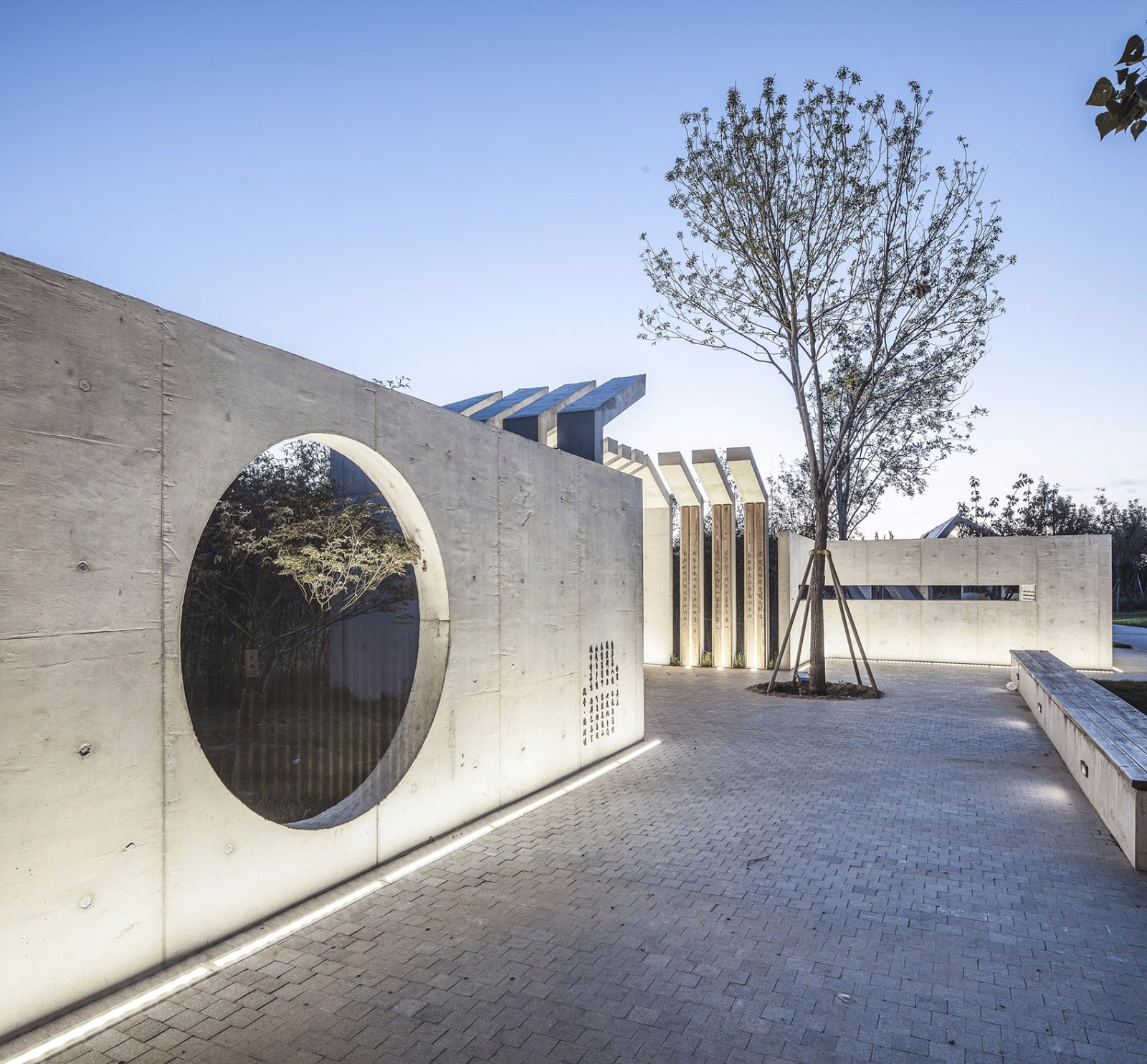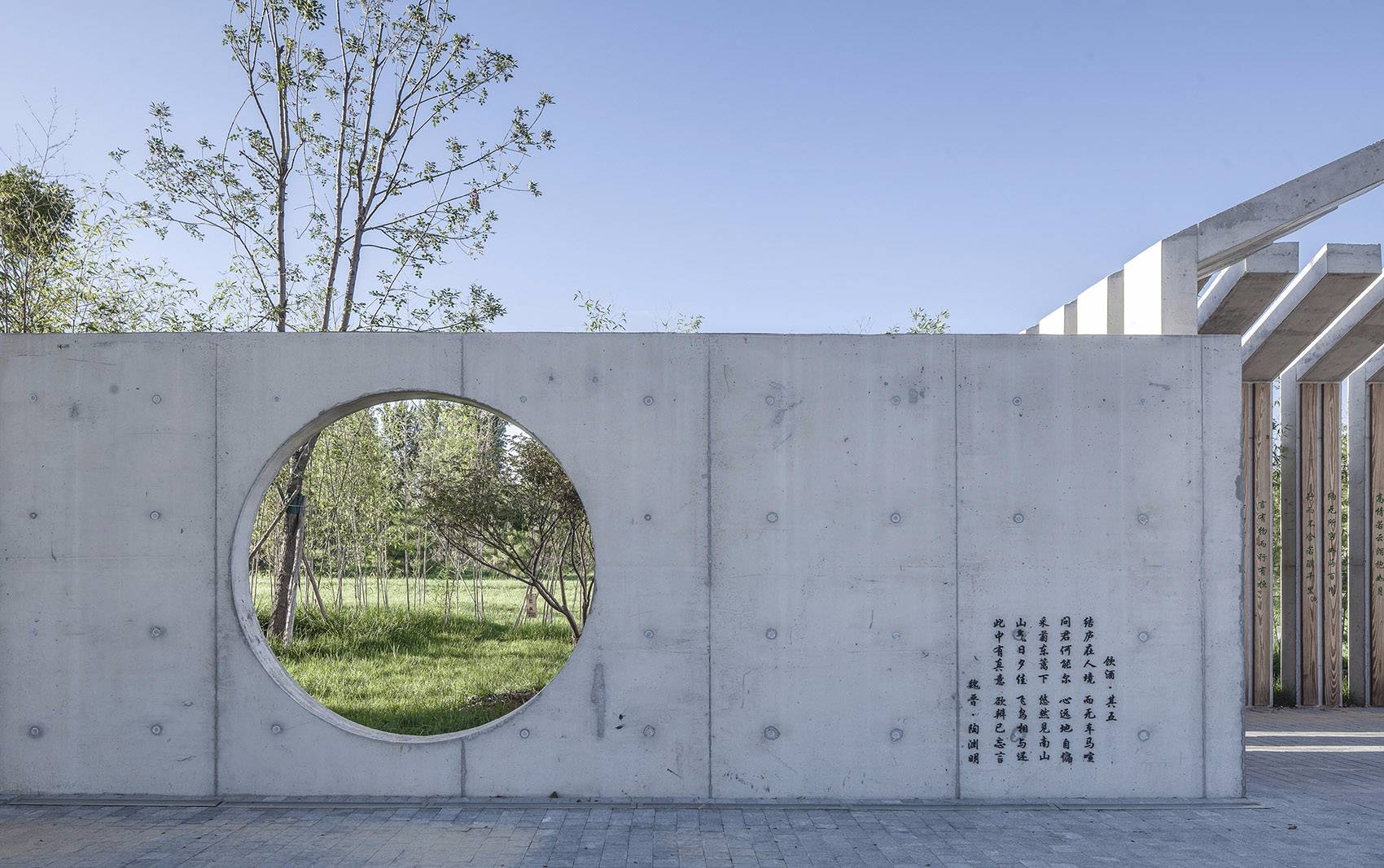 暢想園是生態(tài)文明建設(shè)公園的第一樂章,以暢想自然渴望田園為主題,反映人類與生俱來對自然環(huán)境的親近欲望。位于暢想園內(nèi)的瞻古望今園是一組連續(xù)線狀群組灰建筑,緊鄰和平行一級園路,由歸思園與冀盼廊兩部分組成,為砼現(xiàn)澆帶型觀景灰建筑。其中歸思園以中國古書“竹簡”為設(shè)計原型,提取中國傳統(tǒng)園林的空間特征,營造觀賞空間。通過山水田園詩的意趣渲染陳述,細(xì)致描摹中國人向往中的山水田園。冀盼廊則以抽象幾何形式的變化組合,構(gòu)成可供休憩的游廊。這一組線性序列空間,尺度宜人、材料純凈;借用抽象建筑符號、墻頂轉(zhuǎn)換或消失或洞口等富有趣味的建筑手法引導(dǎo)游人視線和行為體驗;結(jié)合墻面天棚精煉世界在應(yīng)對環(huán)境變化中努力與歷程的文字使游者在片段的事件記錄里,認(rèn)識、理解和遐想。