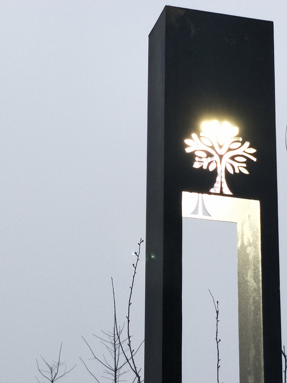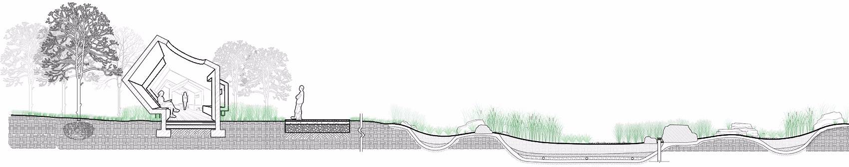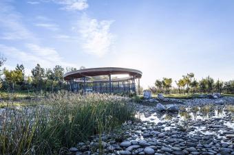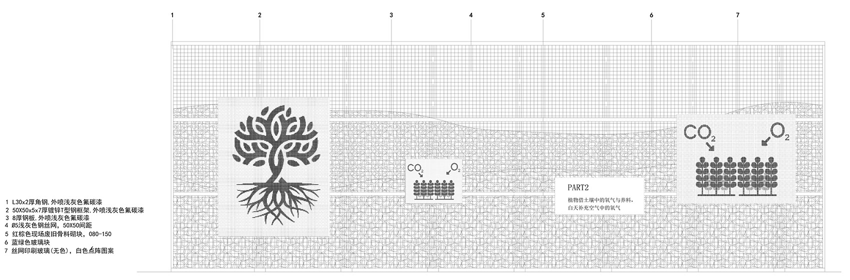 位于智慧園內(nèi)的永續(xù)廊是由拆遷廢料作為墻體填充骨料構(gòu)成的圓形石籠景墻、鋼木作為支撐結(jié)構(gòu)和頂部構(gòu)件共同構(gòu)成的大型休憩空間,由一級園路與暢想園的瞻古望今連接。永續(xù)廊四面墻體分別在石籠墻體外以有機玻璃圖示展示植物生長于土壤、植物生長與自然界交流、動物生長與植物的關(guān)系、及動植物遺骸在有機物微生物作用下對土壤成分的補充等自然界生態(tài)系統(tǒng)的循環(huán)共生過程。永續(xù)廊是靜態(tài)敘事的,傳達(dá)了生態(tài)系統(tǒng)循環(huán)往復(fù)、生生不息永恒命題。圍合構(gòu)筑物的中間是兩頭廢舊鋼絲箍扎的麋鹿,徜徉在清草地上遠(yuǎn)處是淺淺的濕地,呈現(xiàn)祥和溫順的自然界畫面。