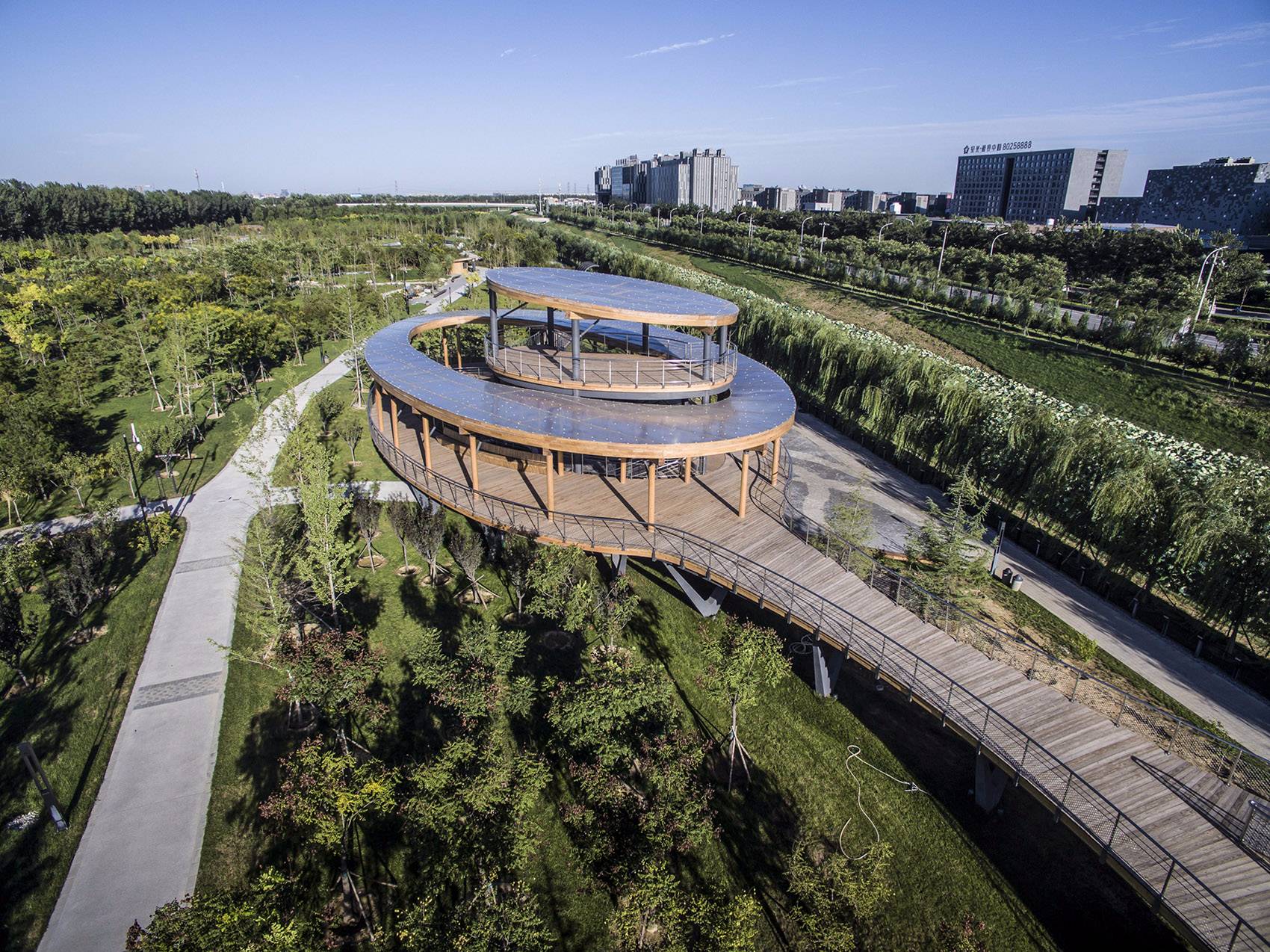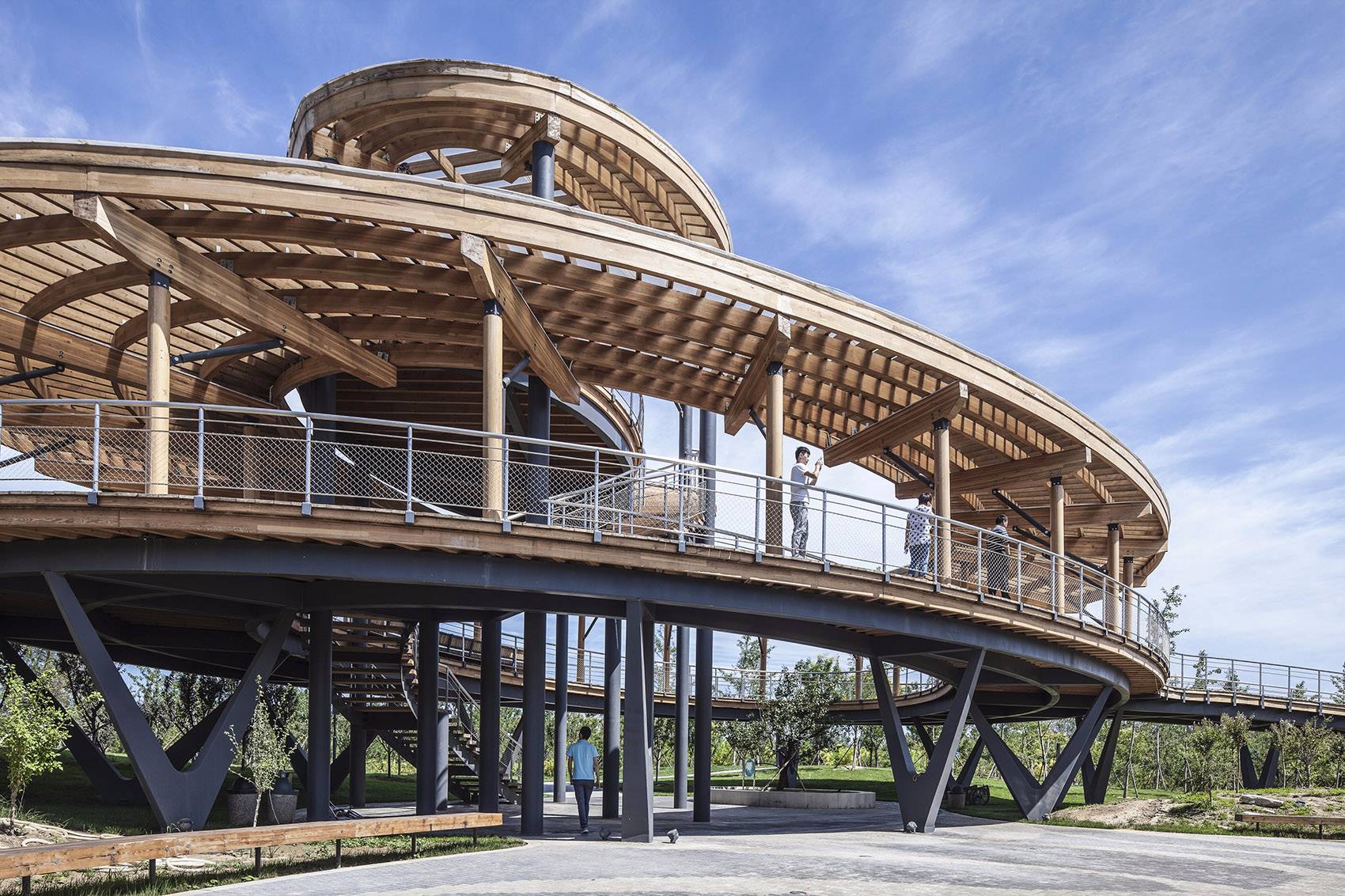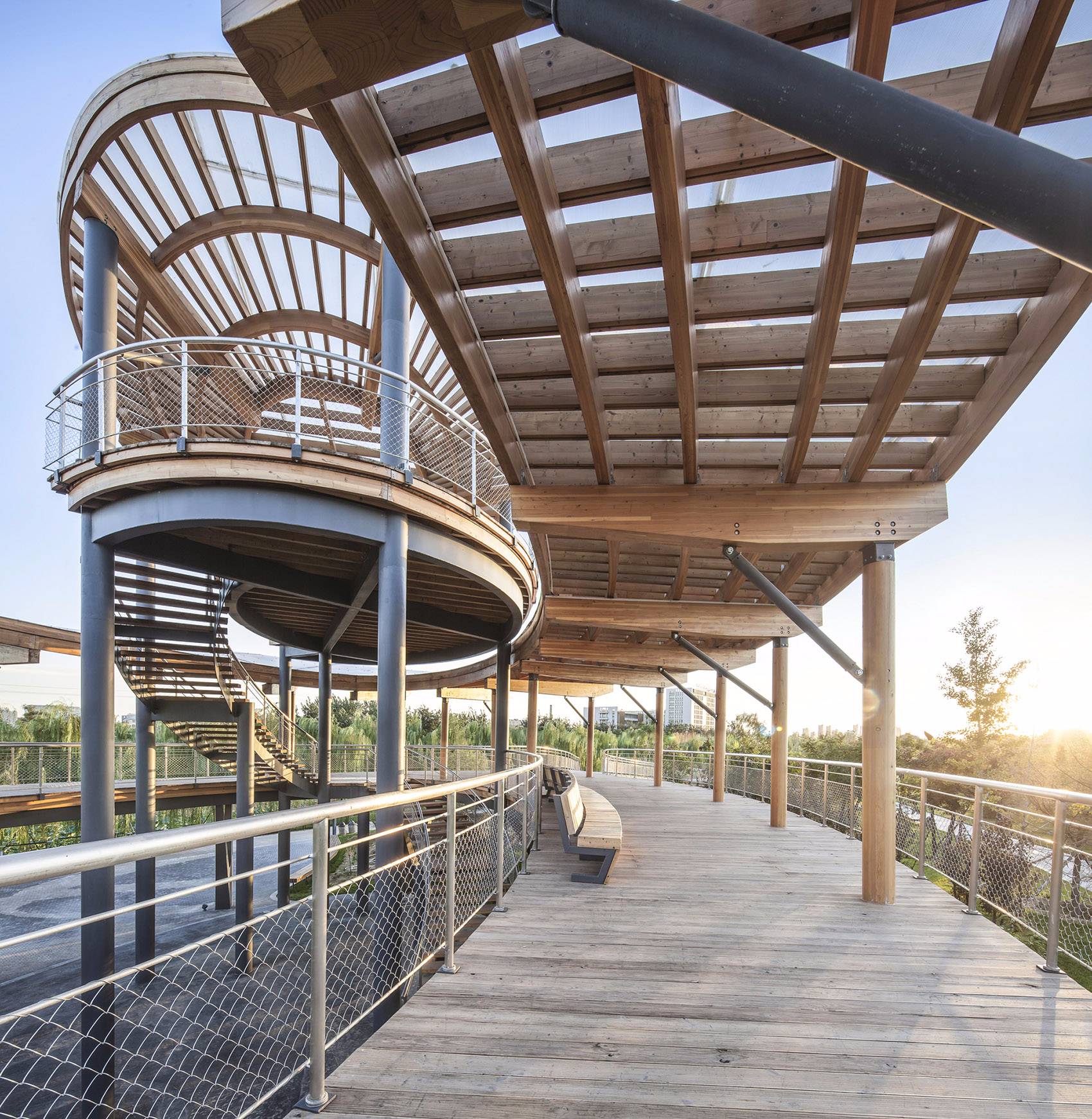 智慧園是生態(tài)文明公園的知識科普與生態(tài)意識引導(dǎo)基地。位于智慧園內(nèi)的大型灰建筑翠波廊橋為鋼木結(jié)構(gòu)結(jié)合的景觀游橋,主體二層局部三層,緊鄰二級生態(tài)步行道。150米凌空飛動的橋體作為廣陽大街的北端的獨特城市標(biāo)識物,既強化北興路的城市景觀界面,也成為重要的城市節(jié)點,與產(chǎn)業(yè)園區(qū)蒸蒸日上的發(fā)展互為對景,隱含對生態(tài)文明和城市發(fā)展的禮贊。橋體下部采用Y型鋼柱承載與基礎(chǔ)焊接,有如翚斯飛之動勢;上部采用重型膠合梁、木柱、局部加鋼構(gòu)穩(wěn)固件的復(fù)合木結(jié)構(gòu)形式。翠波廊橋是行為和時間移動下游者自發(fā)體會和聯(lián)想(被)敘事方式;是短暫旅行后的浪漫想象。游者隨著引橋及環(huán)形平臺可直至第三層平臺,在高程不斷變化中在林端行走、憑欄遠(yuǎn)眺,感受獨特的觀賞體驗。近視可俯看滿園綠色及中部植樹節(jié)紀(jì)念林地;平視可眺望大興及新媒體產(chǎn)業(yè)基地的城市變遷;遠(yuǎn)視可目及大興城市剪影和西山余暉。自然、城市和內(nèi)心的“暢神”融為一體。
