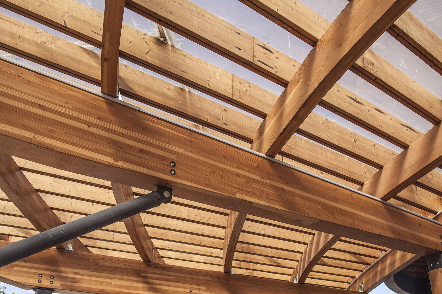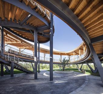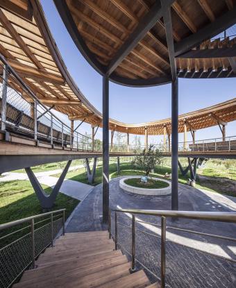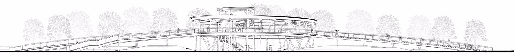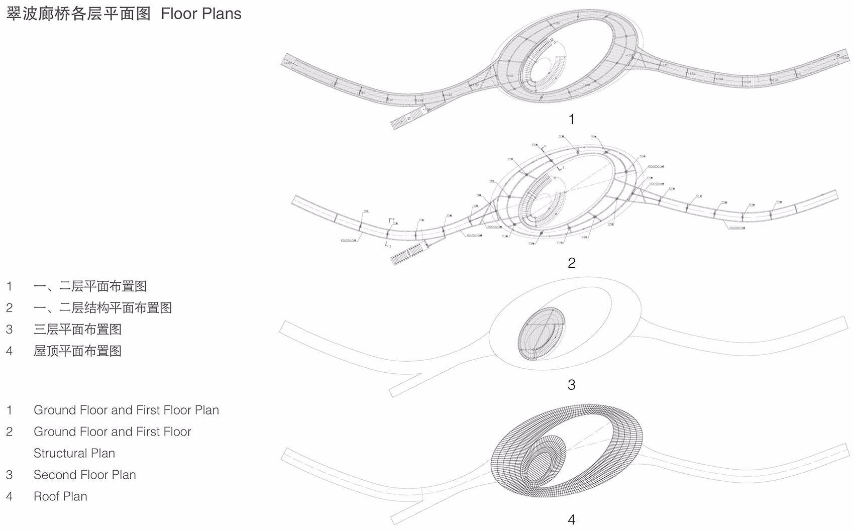 智慧園是生態(tài)文明公園的知識科普與生態(tài)意識引導(dǎo)基地。位于智慧園內(nèi)的大型灰建筑翠波廊橋為鋼木結(jié)構(gòu)結(jié)合的景觀游橋,主體二層局部三層,緊鄰二級生態(tài)步行道。150米凌空飛動的橋體作為廣陽大街的北端的獨特城市標(biāo)識物,既強化北興路的城市景觀界面,也成為重要的城市節(jié)點,與產(chǎn)業(yè)園區(qū)蒸蒸日上的發(fā)展互為對景,隱含對生態(tài)文明和城市發(fā)展的禮贊。橋體下部采用Y型鋼柱承載與基礎(chǔ)焊接,有如翚斯飛之動勢;上部采用重型膠合梁、木柱、局部加鋼構(gòu)穩(wěn)固件的復(fù)合木結(jié)構(gòu)形式。翠波廊橋是行為和時間移動下游者自發(fā)體會和聯(lián)想(被)敘事方式;是短暫旅行后的浪漫想象。游者隨著引橋及環(huán)形平臺可直至第三層平臺,在高程不斷變化中在林端行走、憑欄遠(yuǎn)眺,感受獨特的觀賞體驗。近視可俯看滿園綠色及中部植樹節(jié)紀(jì)念林地;平視可眺望大興及新媒體產(chǎn)業(yè)基地的城市變遷;遠(yuǎn)視可目及大興城市剪影和西山余暉。自然、城市和內(nèi)心的“暢神”融為一體。
