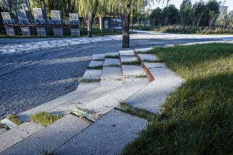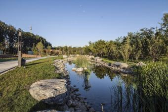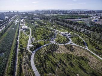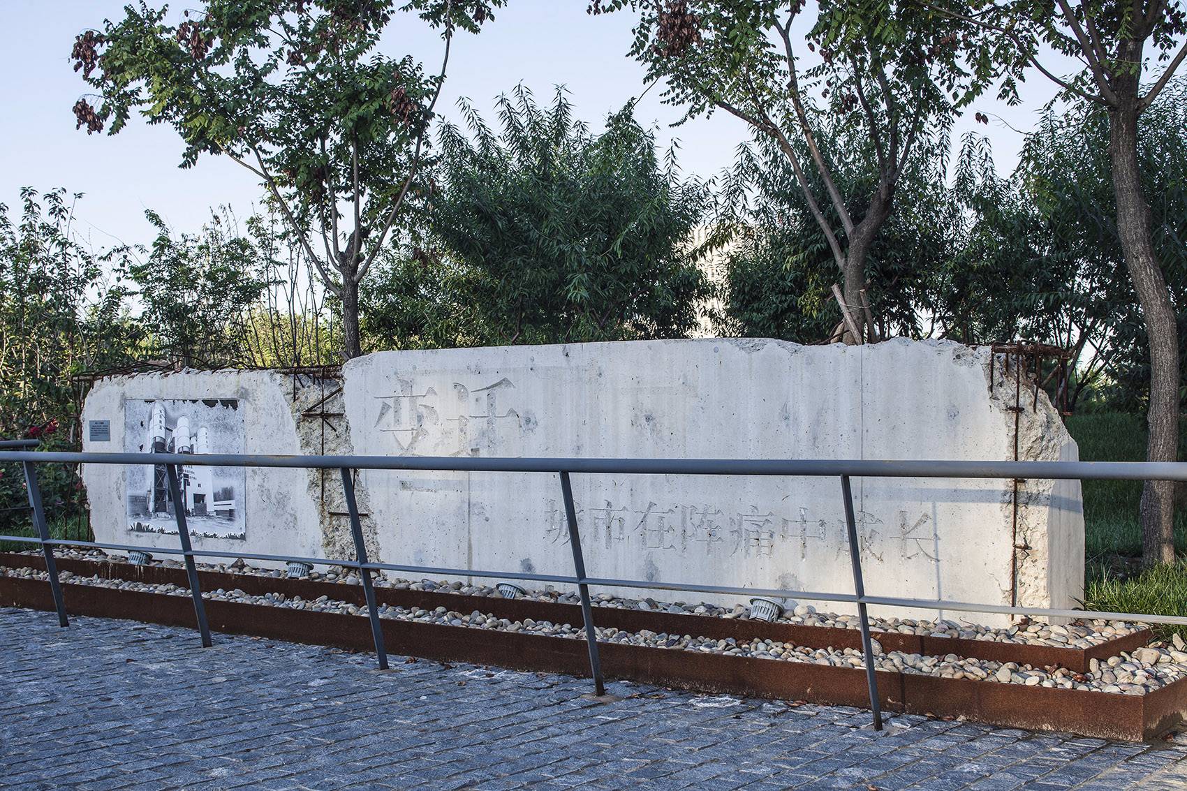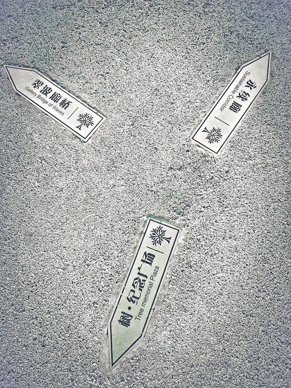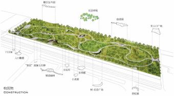 傳統(tǒng)景園中的建筑小品(或景觀小品)被重新定義為更為積極的“灰建筑”概念, 即介于建筑和景觀之間的模糊空間和構(gòu)筑物,具有建筑和景觀的雙重個性。五環(huán)公園內(nèi)的“灰建筑”群具有完整而樸素的空間形態(tài)、意義象征或暗示、以及整體材料性征,形成一系列“事件”性場所,并積極鼓勵游人參與“事件”和體驗。構(gòu)筑物的建造運用了混凝土、碳化木混合結(jié)構(gòu)等樸素自然純粹的構(gòu)造方式;并運用大量拆遷廢棄可循環(huán)材料磚砌塊、混凝土、碎骨料等,用作景觀矮墻、雕塑、排水邊溝及墊層、預(yù)制垃圾桶、鋪裝、石籠墻填充料等。