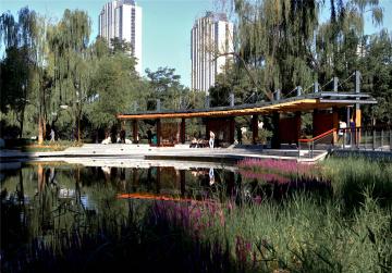 同時我們拆除駁岸,使人可以來到水邊,親近水面,湖心島被恢復(fù)為生態(tài)島,水鳥重新在上面安家。隨著周邊城市土地的開發(fā),這個城市的中心公園變成了居住區(qū)公園,住戶在陽臺上便可鳥瞰全園。