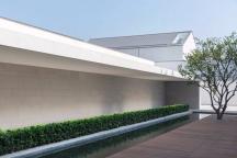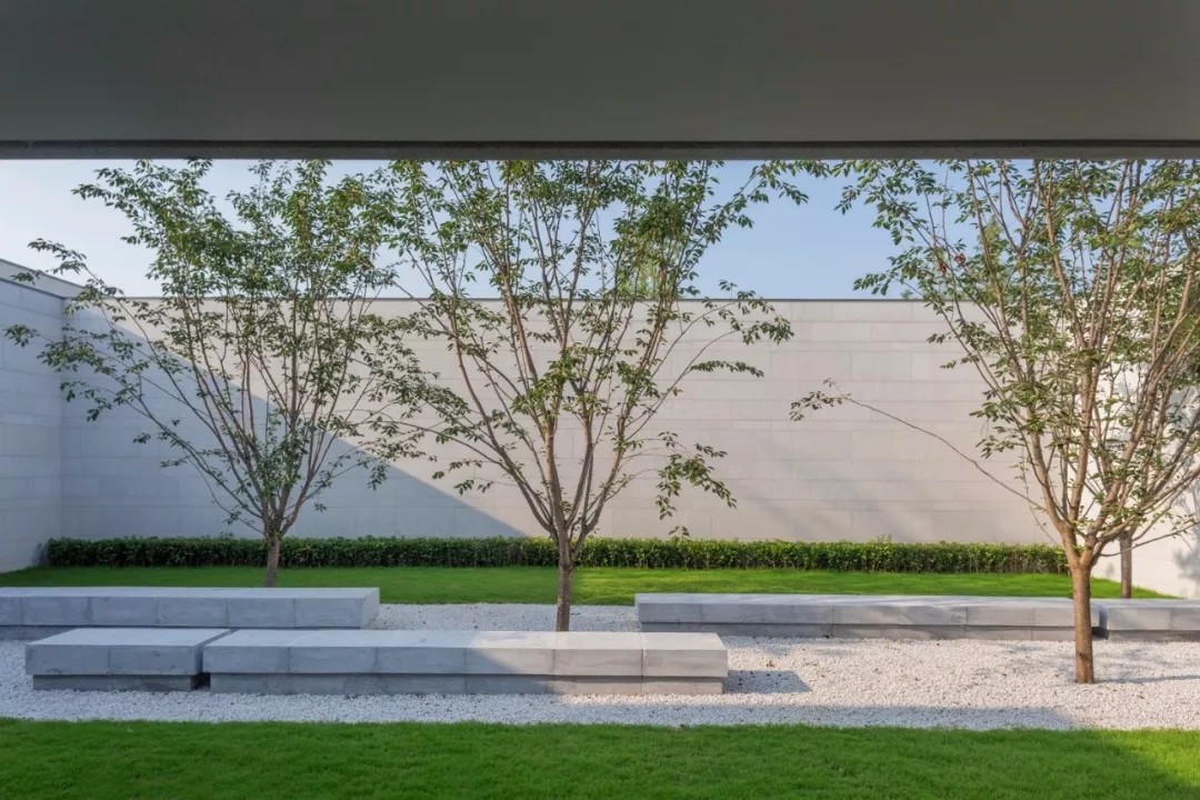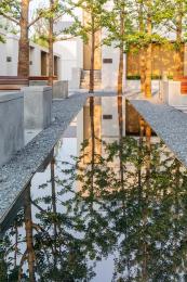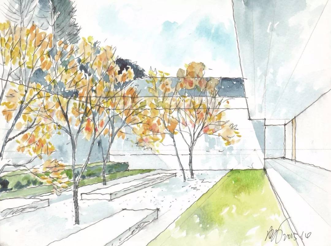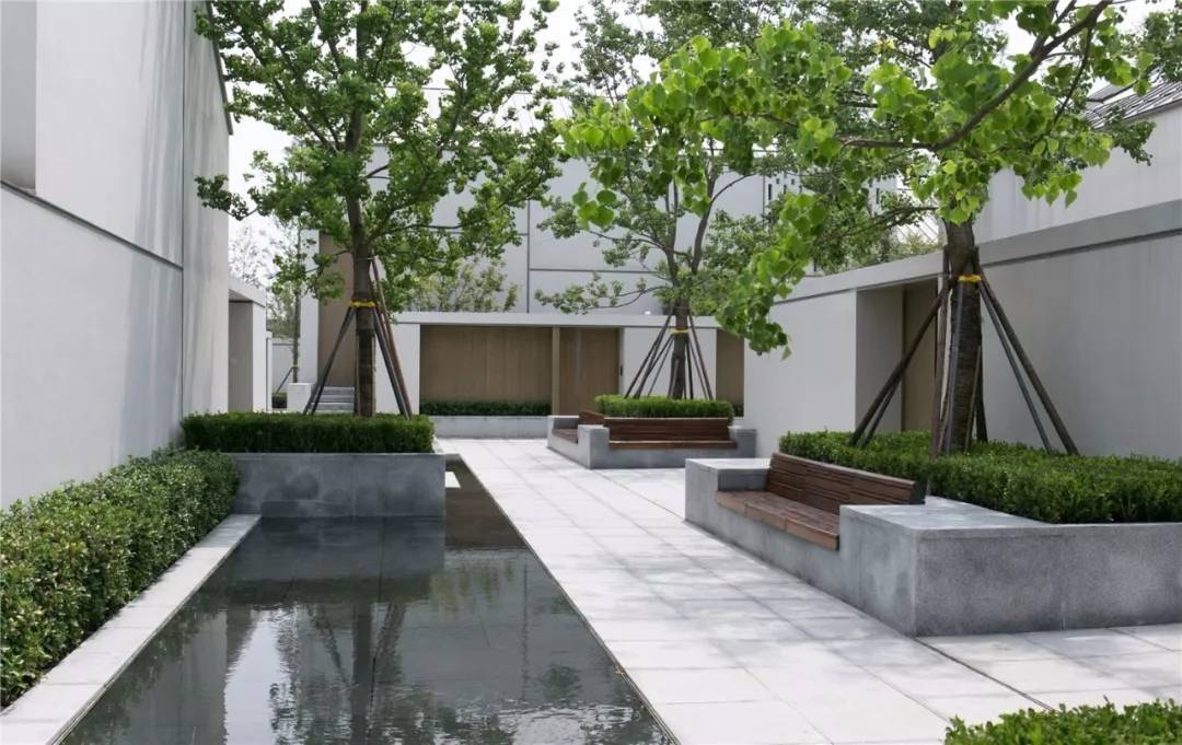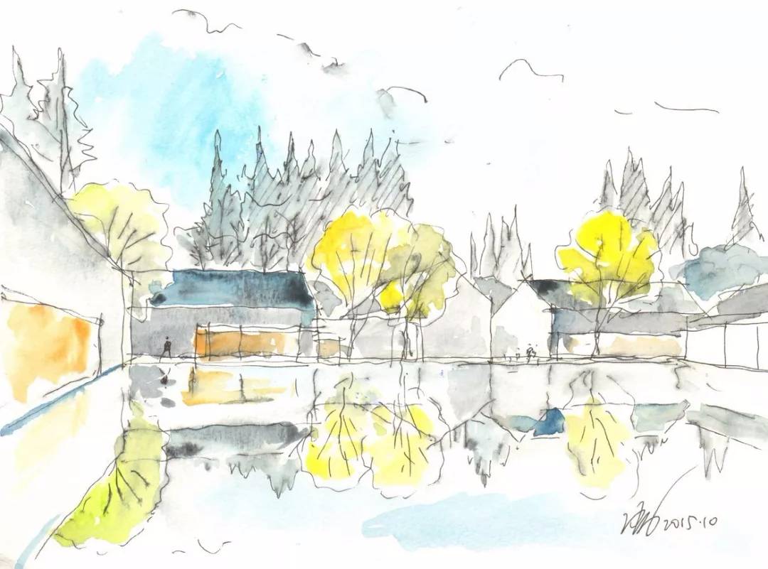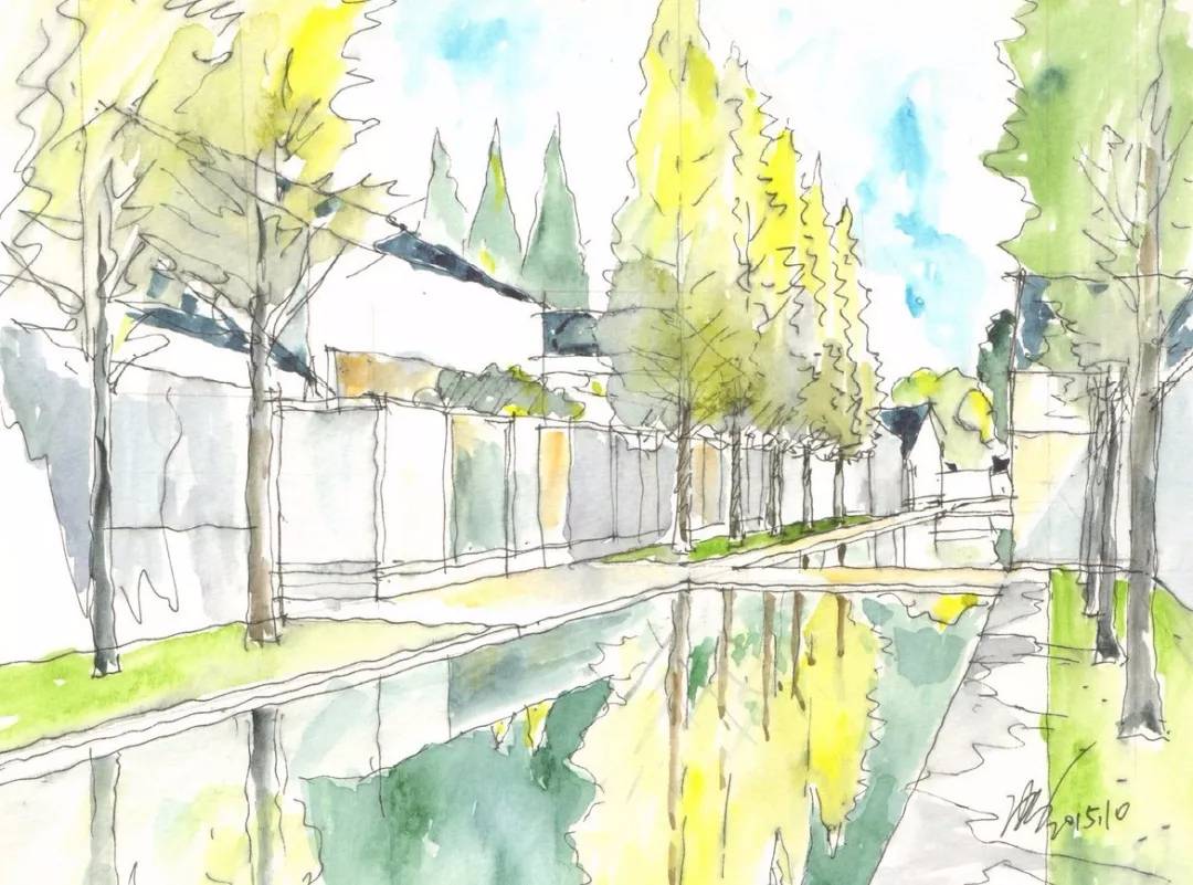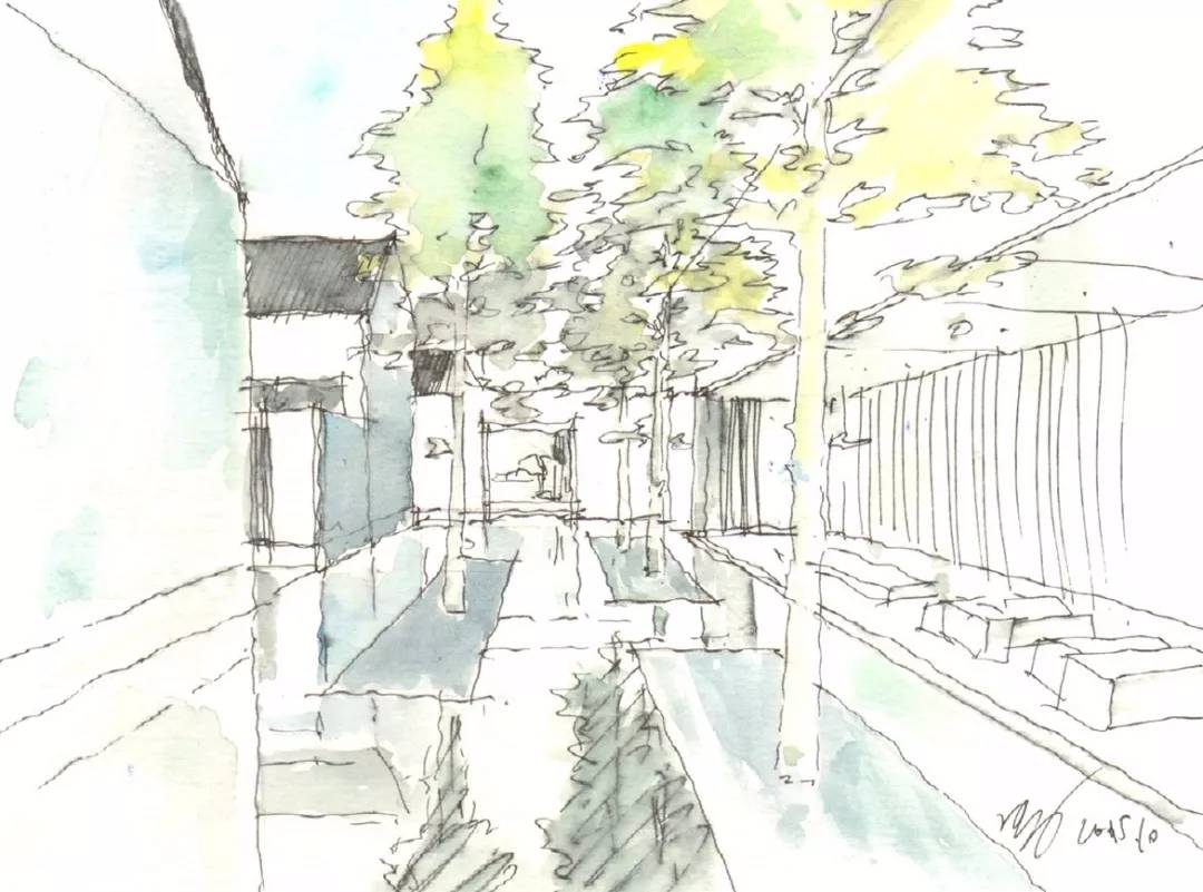 每條水道用瘦高的水杉加強(qiáng)視覺(jué)引導(dǎo)。水杉配白房黑瓦既符合江南水鄉(xiāng)的意向,也是濕地景觀的代表。其缺陷是冬天落葉。這對(duì)于出身于東南亞的Alila酒店管理方比較難以適應(yīng)——他們希望多一些豐富的綠色柔化簡(jiǎn)潔硬朗的建筑線條。我們?cè)谶m當(dāng)加入一些常綠樹(shù)(香樟、胡柚)的同時(shí),向酒管方傳達(dá)該區(qū)域的植物特征:江南地區(qū)常綠樹(shù)種有限,枝細(xì)葉小、姿態(tài)輕盈、符合建筑外觀的樹(shù)形就更加有限。做符合該地域特征的(即使是品牌連鎖酒店)酒店形象最終得到了大家的認(rèn)同。