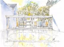 在濕地上建設(shè)這123套客房,工程量浩大。下挖的樁基很深同時(shí)基礎(chǔ)地坪也抬高4米多。盡管如此,每次去現(xiàn)場(chǎng)都有強(qiáng)烈的陰濕的氣息從腳底下生出來(lái),讓人不寒而栗。因?yàn)樗啵摼频暌紤]水鄉(xiāng)中的水道與外圍濕地的關(guān)系,不僅是視覺(jué)上利用主要水道劃分客房組團(tuán),還有酒店內(nèi)水景的凈水系統(tǒng)如何與外圍水體結(jié)合,為滿(mǎn)足雨季的泄洪需要用不同高差控制......