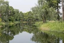 狹長(zhǎng)的水道中散落著成排的水杉。