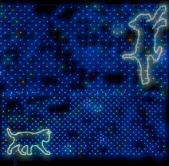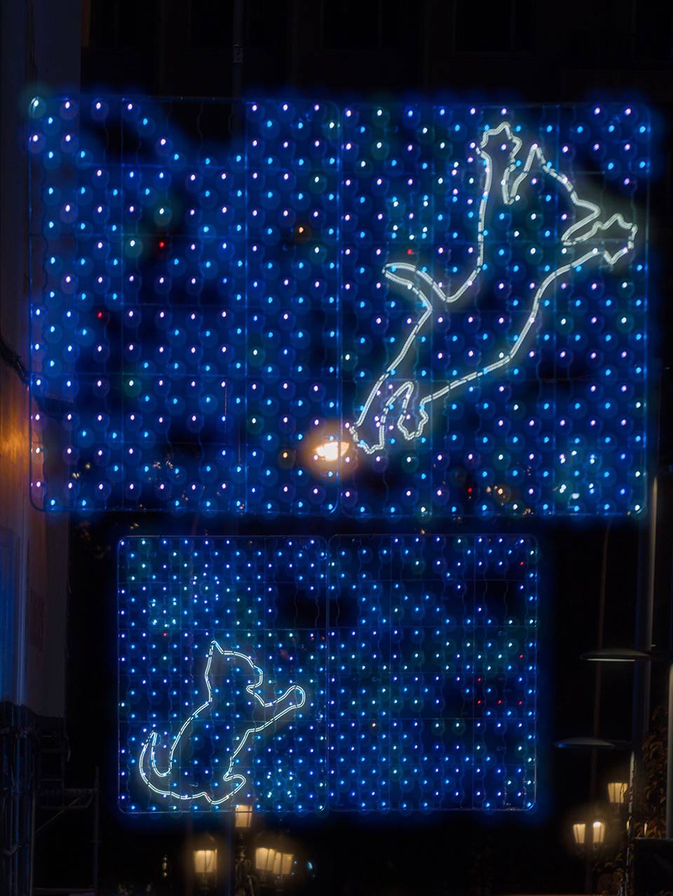 Gran Via是一條呈東西向延伸的街道,藝術(shù)家在其上方覆蓋以人造的星云和假想的銀河,使它變得更加耀眼、繽紛和夢幻。露西亞是一只生活在Gran Via的小貓,會不時地出現(xiàn)在特定的地點,似乎想要捕捉一顆閃爍的星星。