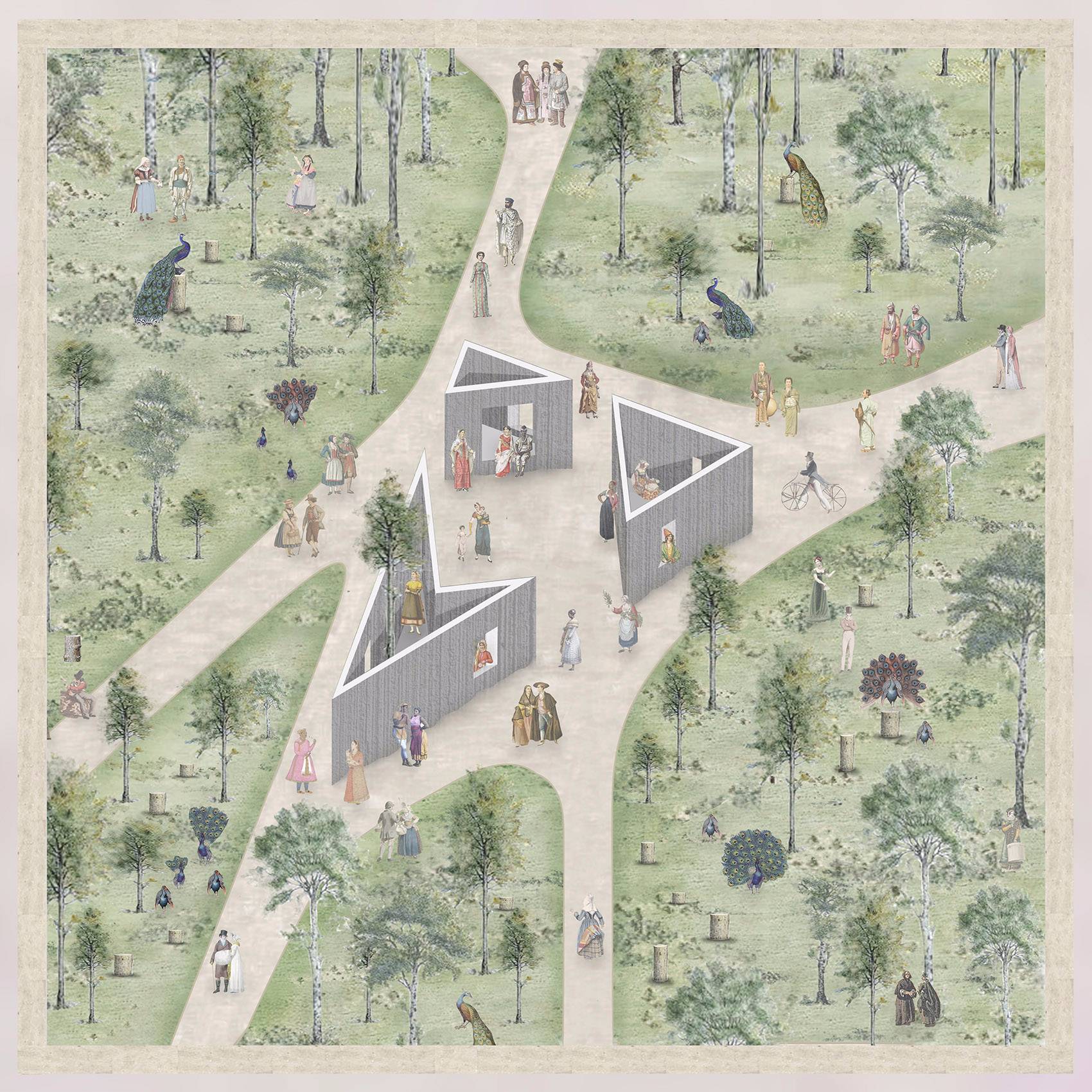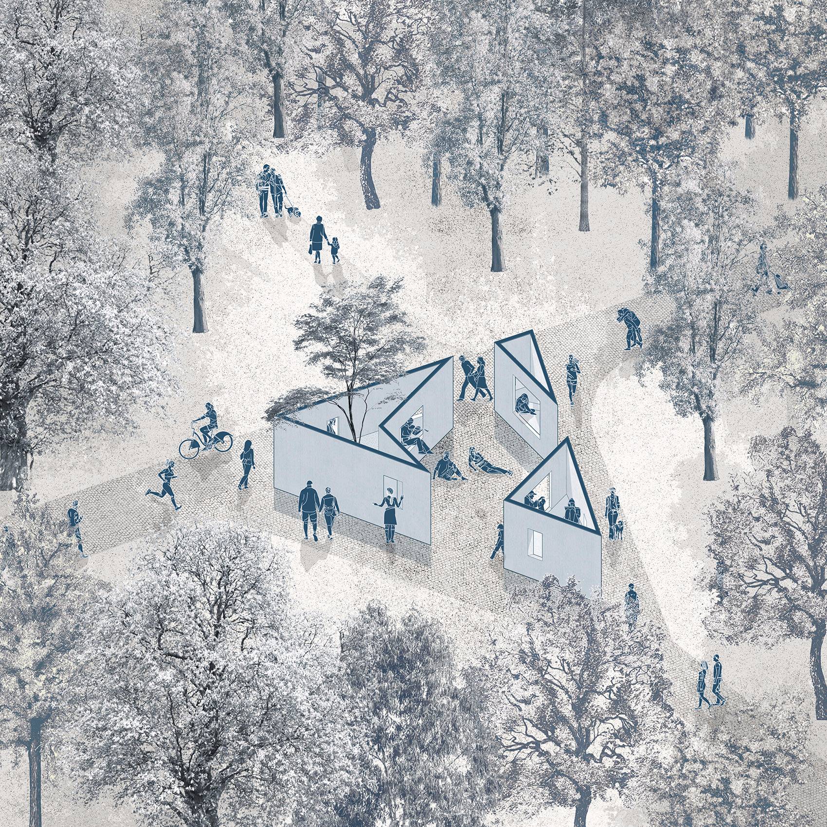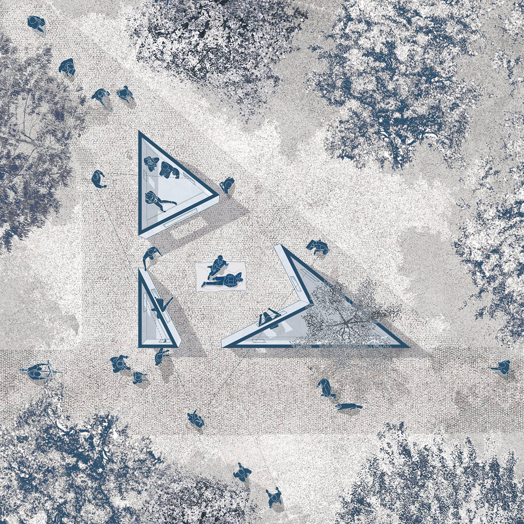 框景花園擴(kuò)寬了公共藝術(shù)與雕塑的概念,為城市居民創(chuàng)造了一個(gè)空間?;▓@位于Fontelo公園內(nèi)部一個(gè)十字路口,它將原有交通空間轉(zhuǎn)變?yōu)榱丝梢跃奂目臻g。三角外形幾何元素在場(chǎng)地路徑中突顯出來,內(nèi)部方形空間則成為了集體表演的劇院空間。
