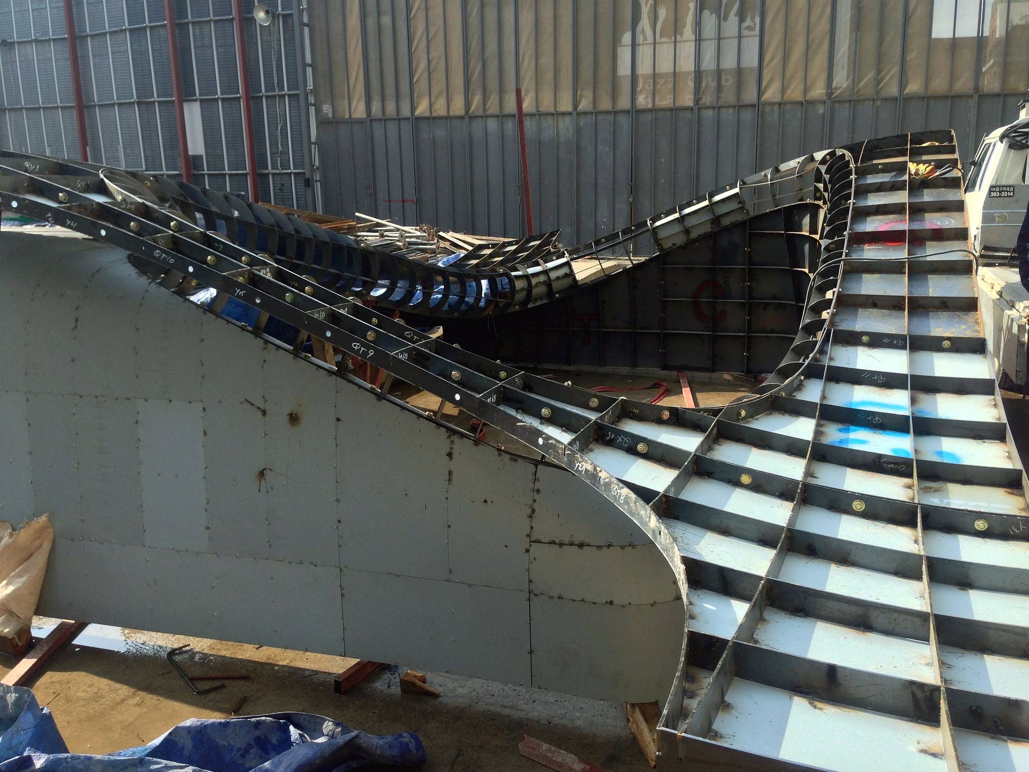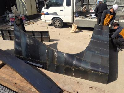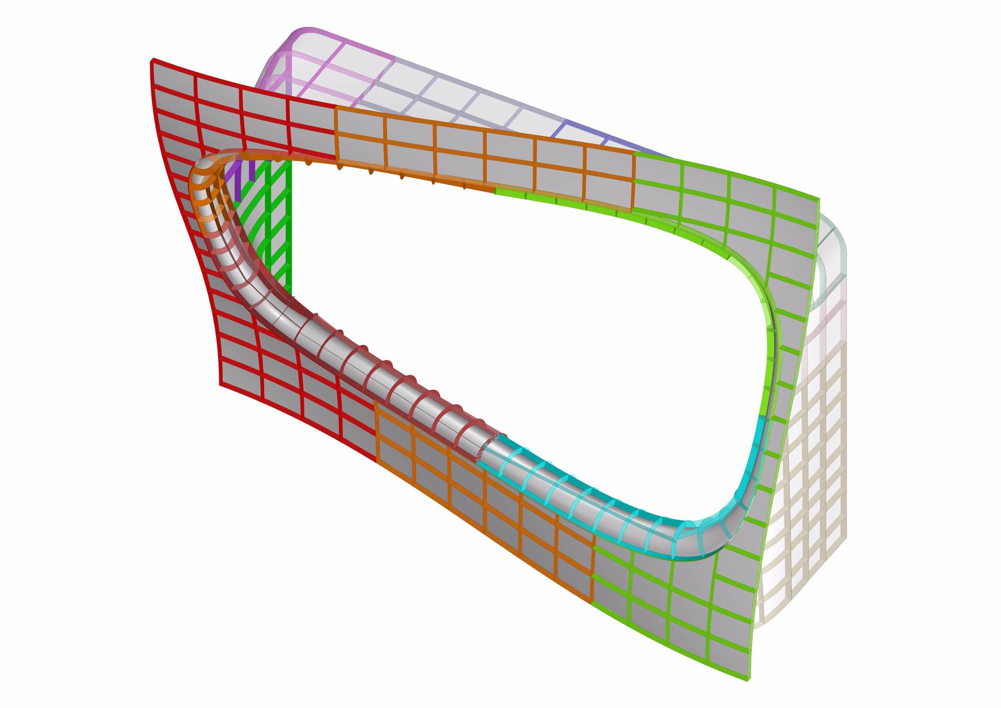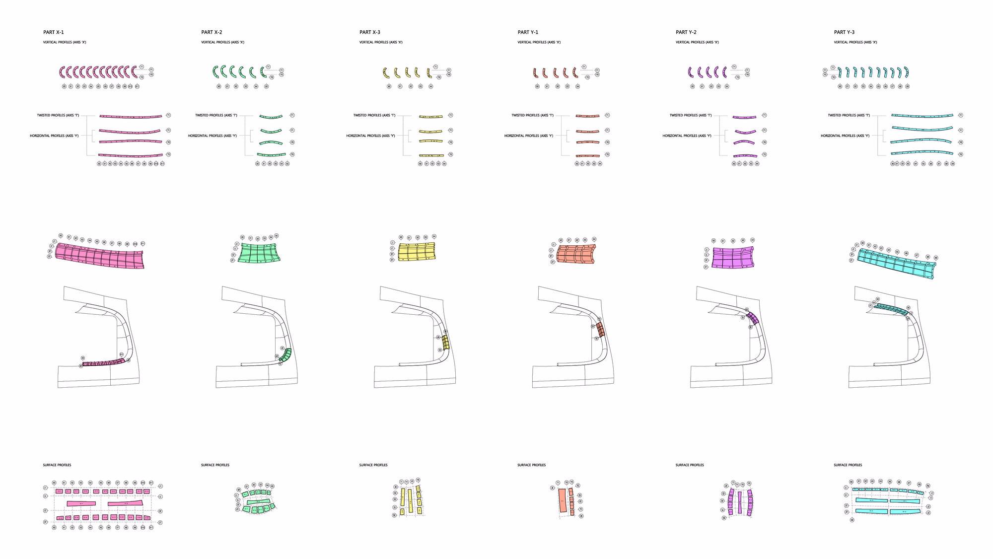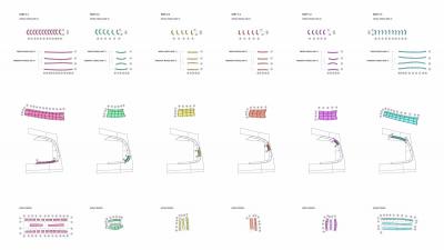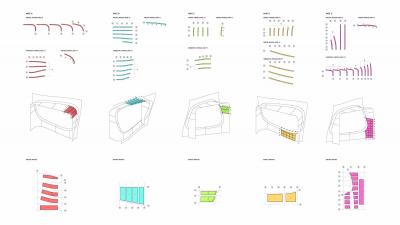 制作了鋼板分模系統(tǒng),能夠提前組裝并在現(xiàn)場構(gòu)建一系列的三維曲面立面結(jié)構(gòu)。將混凝土澆注到三維模具中,在拐點處模具需要分離鑄件。分模的性質(zhì)要求施工人員能夠在混凝土的截面澆筑。然后在一個剖面傾倒最后倒在鏡面頂部。顏色編碼法則幫助現(xiàn)場工作人員能夠輕松了解過程,這也為施工人員創(chuàng)造了新的工作環(huán)境。