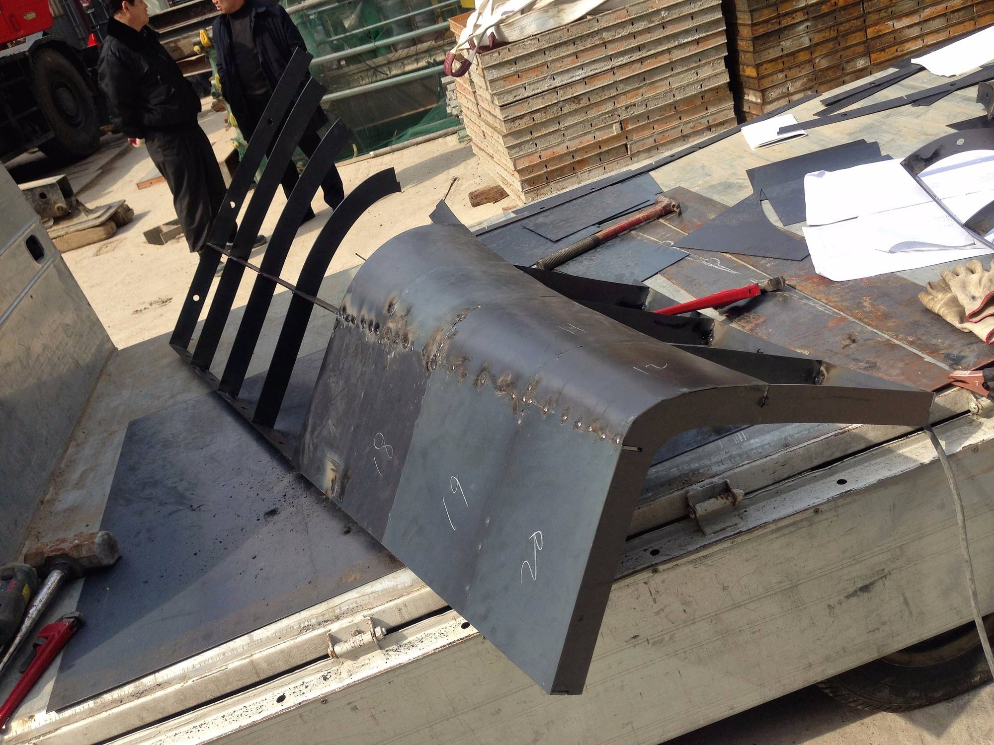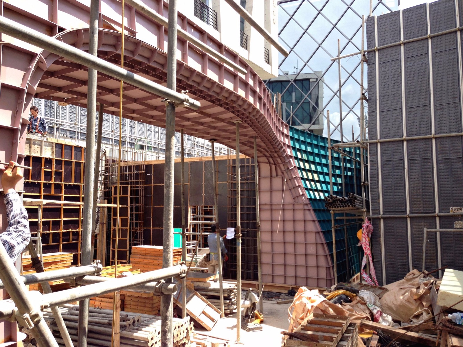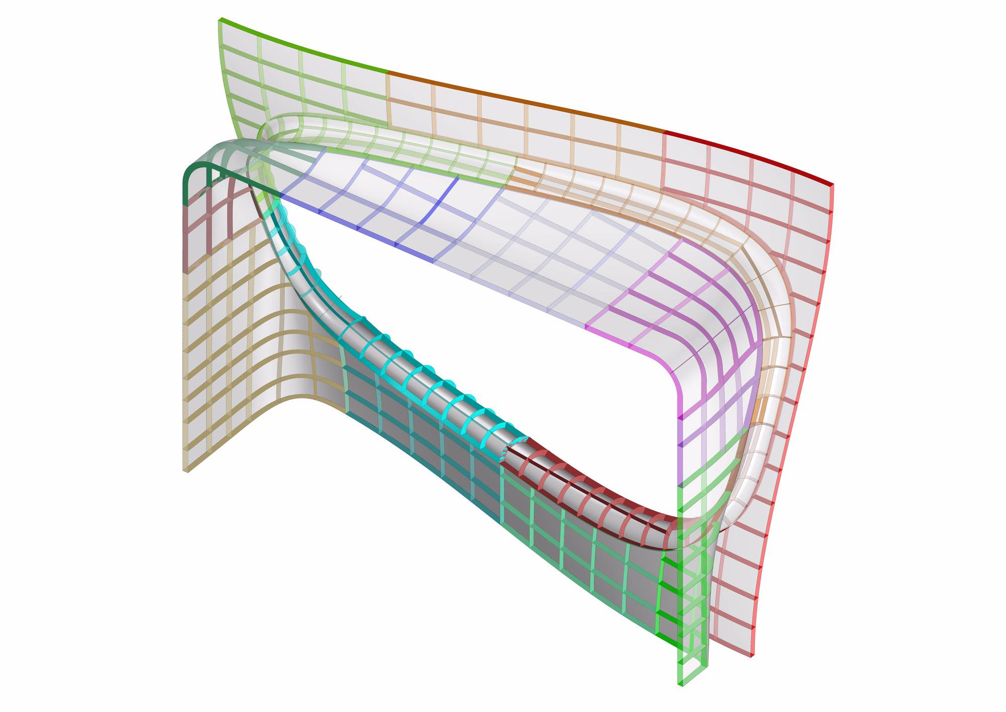制作了鋼板分模系統(tǒng),能夠提前組裝并在現(xiàn)場構(gòu)建一系列的三維曲面立面結(jié)構(gòu)。將混凝土澆注到三維模具中,在拐點處模具需要分離鑄件。分模的性質(zhì)要求施工人員能夠在混凝土的截面澆筑。然后在一個剖面傾倒最后倒在鏡面頂部。顏色編碼法則幫助現(xiàn)場工作人員能夠輕松了解過程,這也為施工人員創(chuàng)造了新的工作環(huán)境。