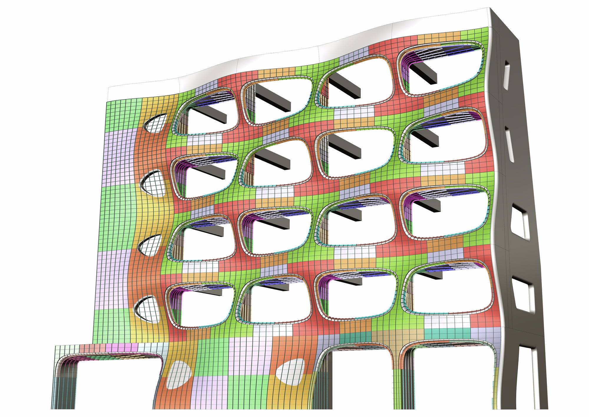 通常狀況下正立面的設(shè)計并未能夠顯示出建筑物的三維方面表征; 然而,隨著視角的變化,建筑帶給人的體驗發(fā)生了巨大變化。這種模式類似于歐普藝術(shù),主要的決定因素來源于觀察者的觀點和角度。從長遠來看,這給建筑物的體量帶來了非常不同的體驗,比如那些在車內(nèi)駕駛的人。我們可以想象路人(當(dāng)他們瞥一眼建筑物)和使用者(站在陽臺上)的短暫交流。這將給那些無表情的城市景觀帶來一點別樣的歡樂。