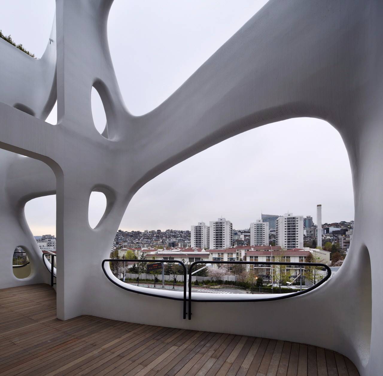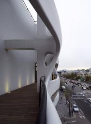 為了創(chuàng)造這樣的陽臺,建筑表皮的外殼成為了結(jié)構(gòu)。主結(jié)構(gòu)和子結(jié)構(gòu)的雙重性允許結(jié)構(gòu)構(gòu)件合并或分開,并在結(jié)構(gòu)之間產(chǎn)生空隙空間以形成陽臺空間。這類似于從哥特式建筑發(fā)展而來的肋骨結(jié)構(gòu),來創(chuàng)建拱形天花板拱肋結(jié)構(gòu)。重復(fù)陽臺之間的波浪語匯以區(qū)分樓層; 在內(nèi)部結(jié)構(gòu)上來看是系統(tǒng)的,但設(shè)計師還是在創(chuàng)造一個不規(guī)則的表殼立面。隨著陽臺而生的辦公空間,使得建筑物的面積有所增加。消解建筑外立面的邊緣使得建筑物的外殼更加自然的形成有機表皮。