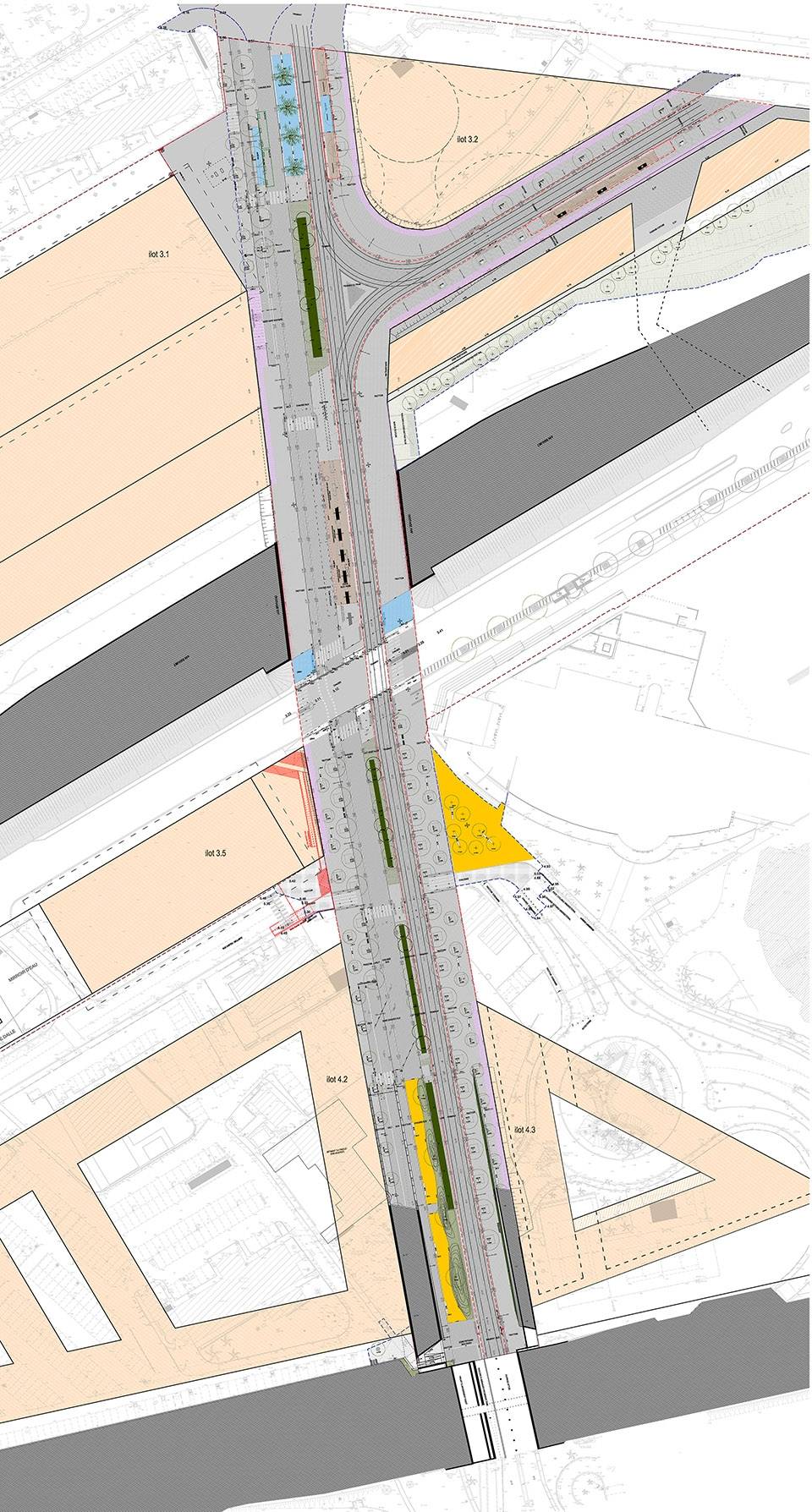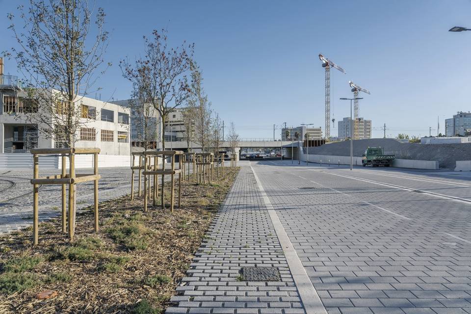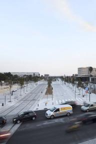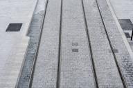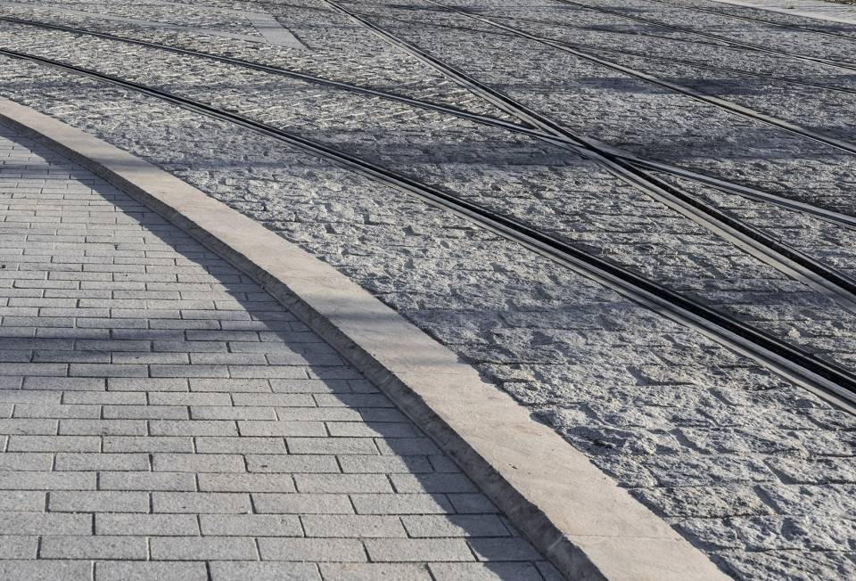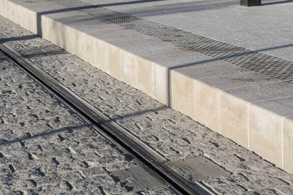 統(tǒng)一所有鋪裝水平面的紋理。所有交通通行的地方都使用天然或人工石材鋪砌。這些紋理邊緣采用了堅(jiān)固的淺色砂巖塊,在地面構(gòu)成微小的水平差異,增加了安全系數(shù)。鋪裝最終呈現(xiàn)效果是連續(xù)的石材紋理,鋪裝由路牙石所限定,并且根據(jù)使用條件不同,在某些特定區(qū)域產(chǎn)生大小和品質(zhì)上的差異。有軌電車軌道之間的空間使用了非常粗糙的石材(為了阻止行人),人行道采用了光滑的花崗巖,公共汽車和自行車道采用自承式高強(qiáng)度混凝土砌塊,它們一同構(gòu)成了一個連續(xù)、規(guī)則但又豐富的地面鋪裝。