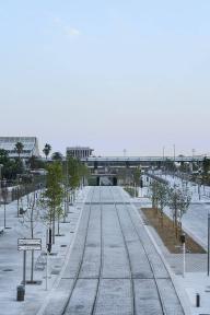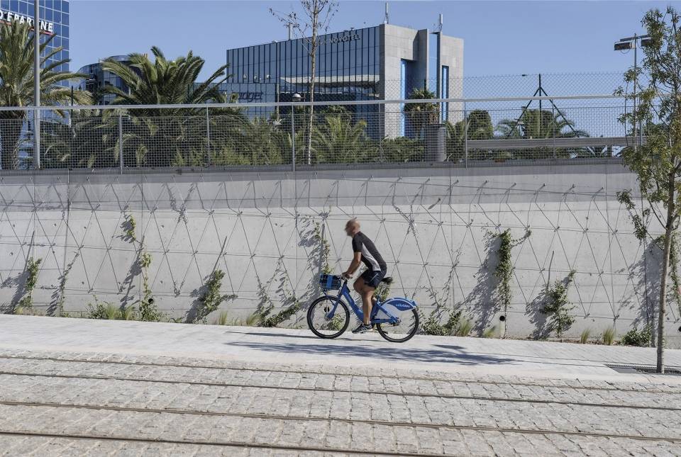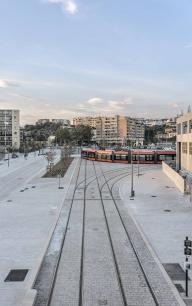 在法國城市Nice的新綜合聯(lián)運(yùn)樞紐主軸線上,歐洲首次建造了一個大面積的城市可冷卻鋪裝路面。它應(yīng)對著行人最密集的區(qū)域(公交站、人行道等等)并且代表了像Nice這樣炎熱氣候的地方改善城市熱環(huán)境的嘗試。它由一個外部傳感器控制的地下灌溉系統(tǒng)構(gòu)成,可以冷卻特殊的可透氣鋪路材料,鋪路材料試驗(yàn)性的使用了軟體動物外殼。