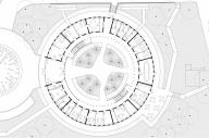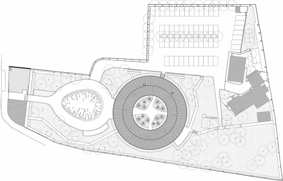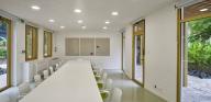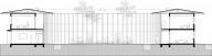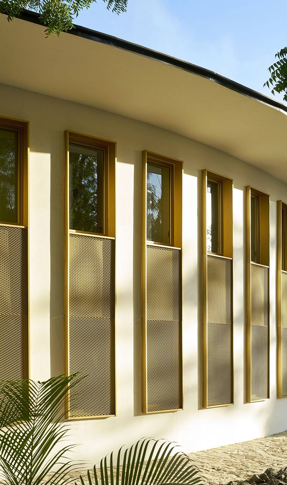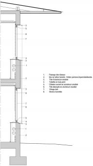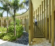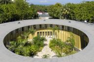 圍繞著中庭,建筑分為兩層,中庭用于自然照明和通風。所有的輔助服務和法國領事館都位于主館內。這些設施被一個大的榮譽花園包裹著,從入口處可以立刻直接看到這個空間,同時它也是所有工作人員和來訪者休閑的舒適場所。服務設施通過一個充滿現(xiàn)代感的帶頂回廊分布??臻g之間親密的連接關系通過花園布局設計的幾個樓梯間和小徑實現(xiàn)。