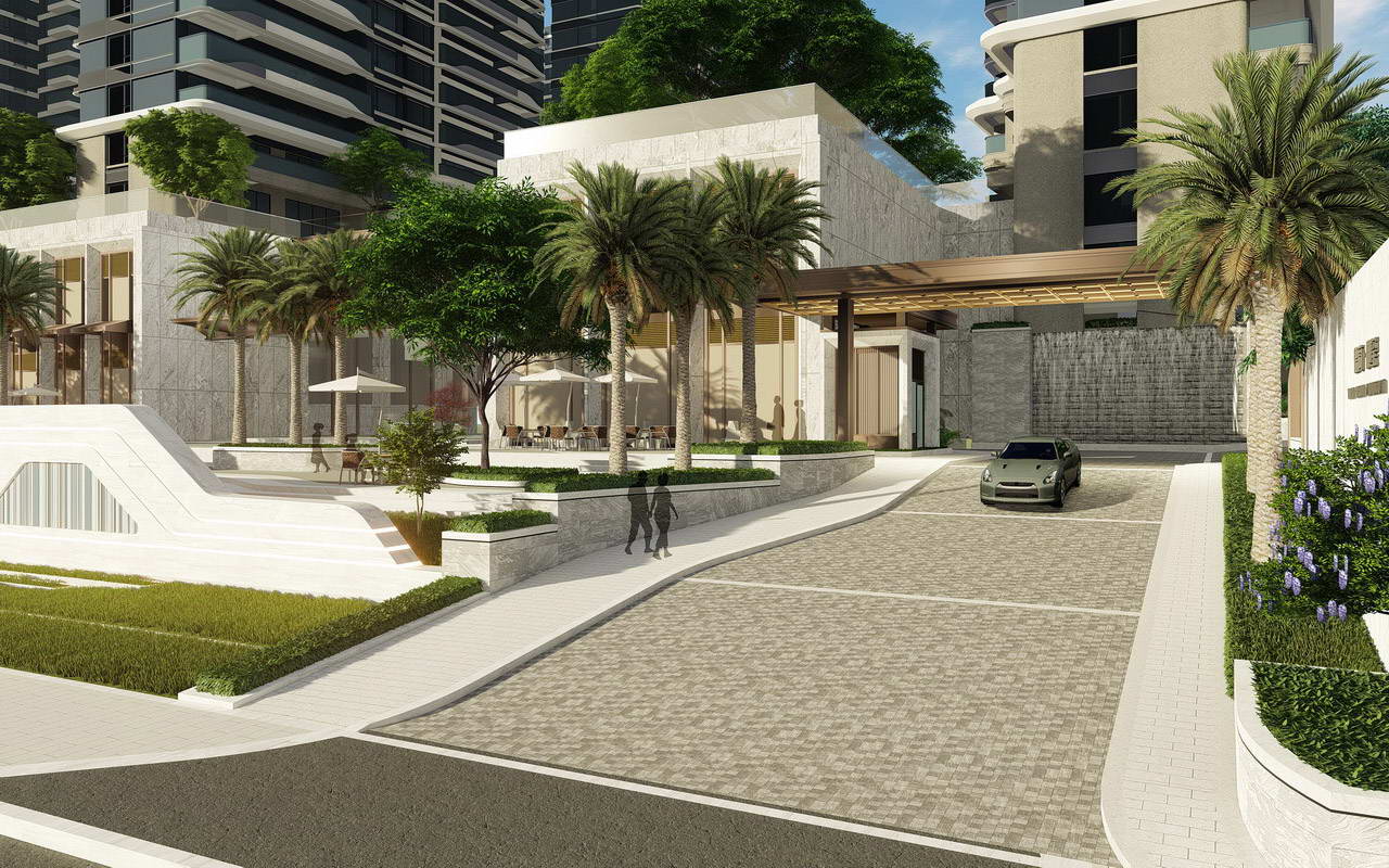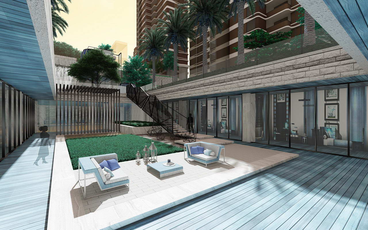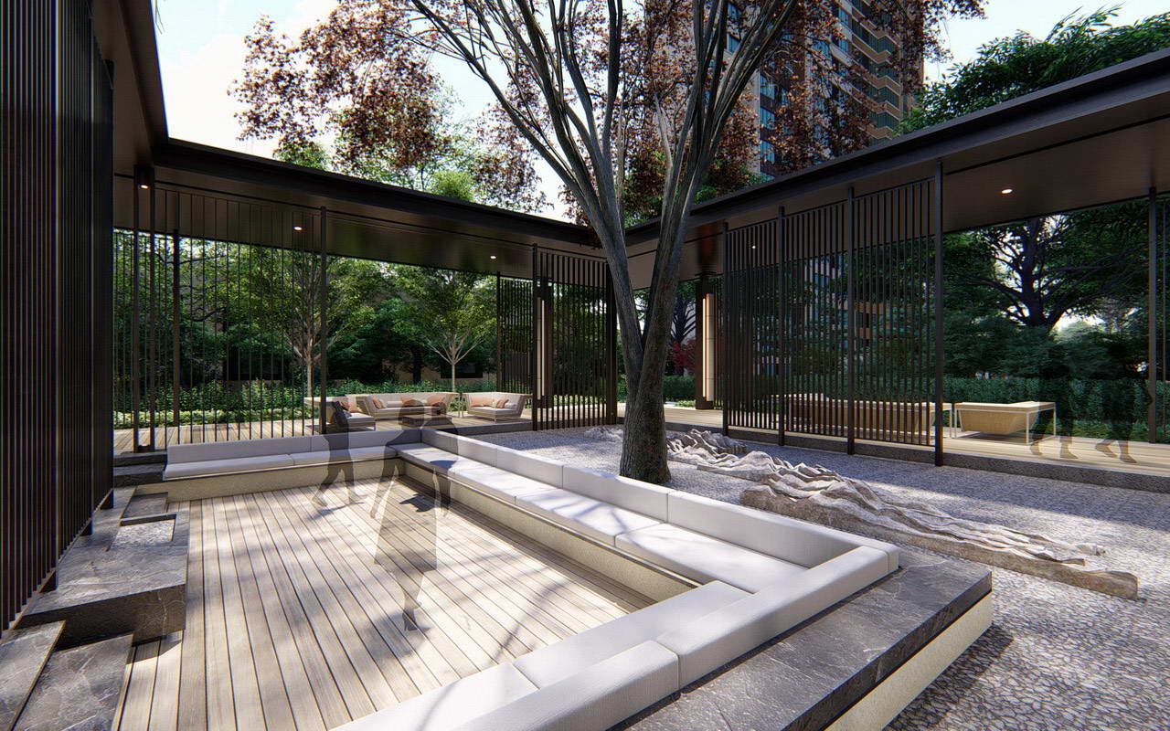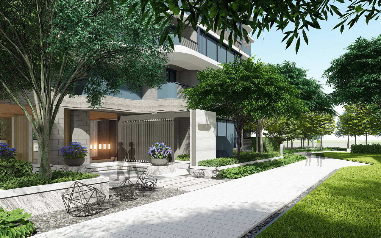 隱謐休閑的大堂花園:將建筑單元入戶大堂向室外延伸,每棟單元入戶增加半私密的庭院空間,訪客及住戶都可以在這里休閑停留,同時提升建筑價值。