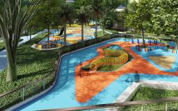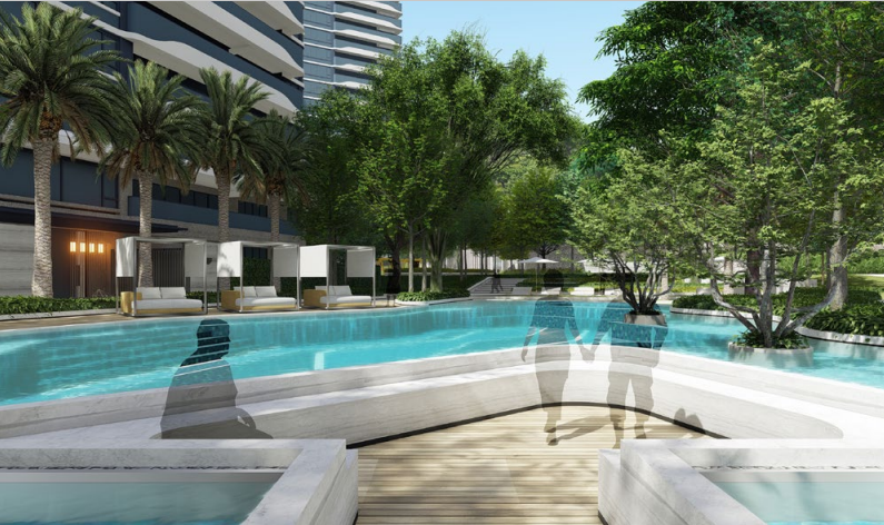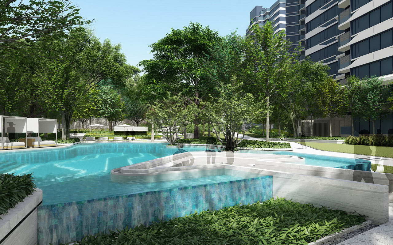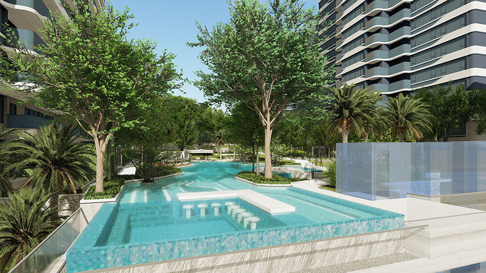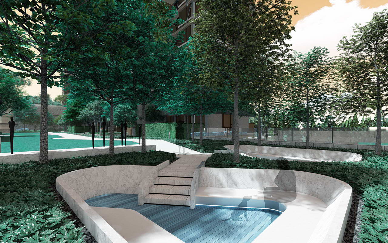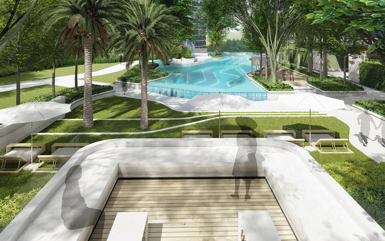 花園泳池:泳池設(shè)計為淺水泳池,讓泳池不僅有功能性,還具備極高的觀賞性和互動性。將泳池與花園融合,在水邊設(shè)計口袋花園,讓客戶停留享受舒適的親水花園空間。