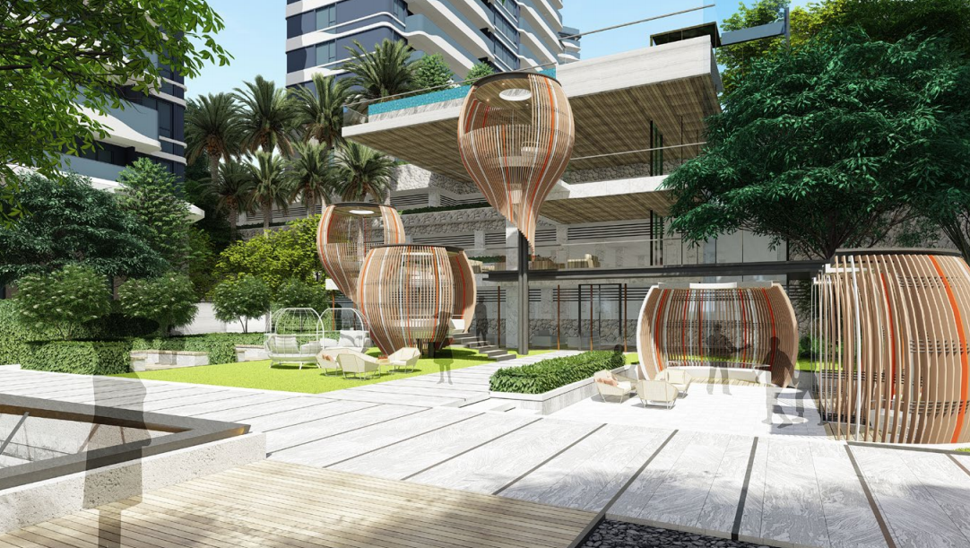 闊達多樣的空中平臺:利用場地的高差,給客戶提供更私密的空間,同時擁有更高更遠的景觀視線。鳥巢造型的空中平臺可與派對泳池結(jié)合,為客戶提供多樣化的派對空間。
